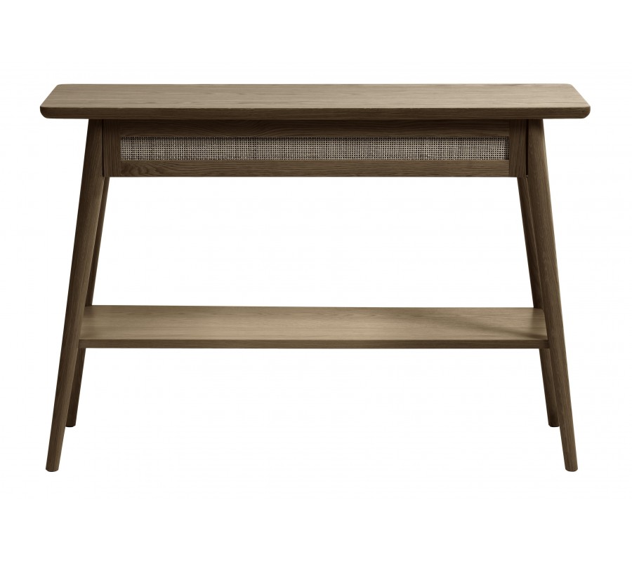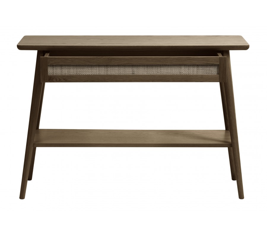 Designový retro konzolový stolek Aarhus v tmavě hnědé barvě s policí a šuplíkem s béžovým ratanovým výpletem 110 cm