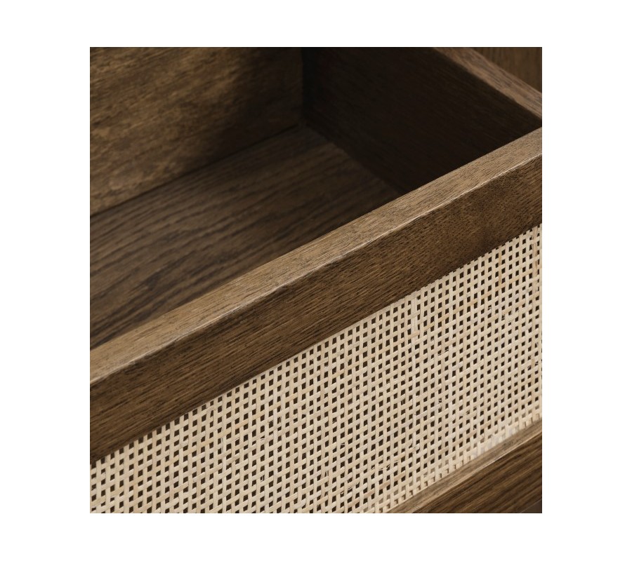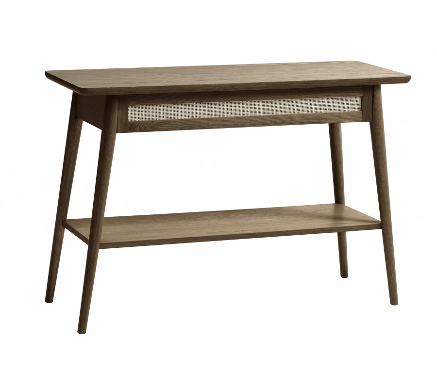 Konzolový stolek je vyroben z kombinace masivního a dýhovaného dubového dřeva. Lakování v tmavě hnědé barvě s přiznanou kresbou letokruhů zvýrazňuje teplý přírodní charakter materiálu a zároveň podtrhuje typický severský vzhled. Ratan ve světle béžové barvě navazuje na přírodní estetiku dřeva a vytváří sofistikovaný barevný akcent.