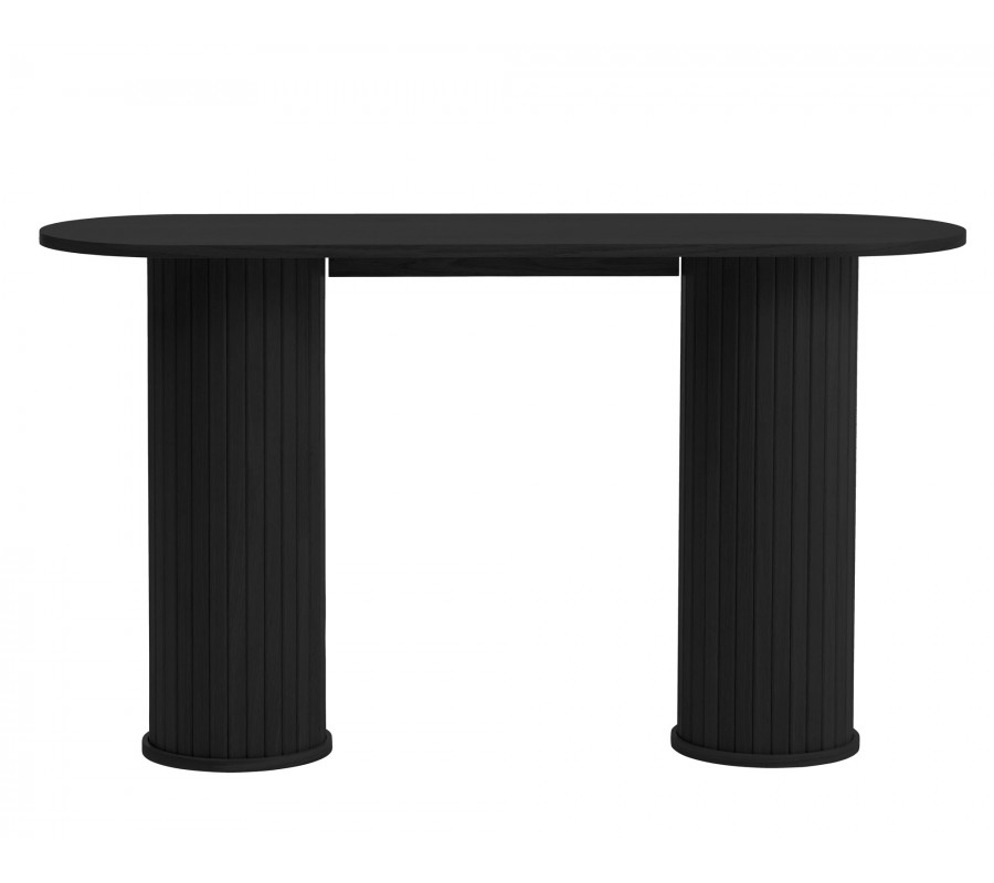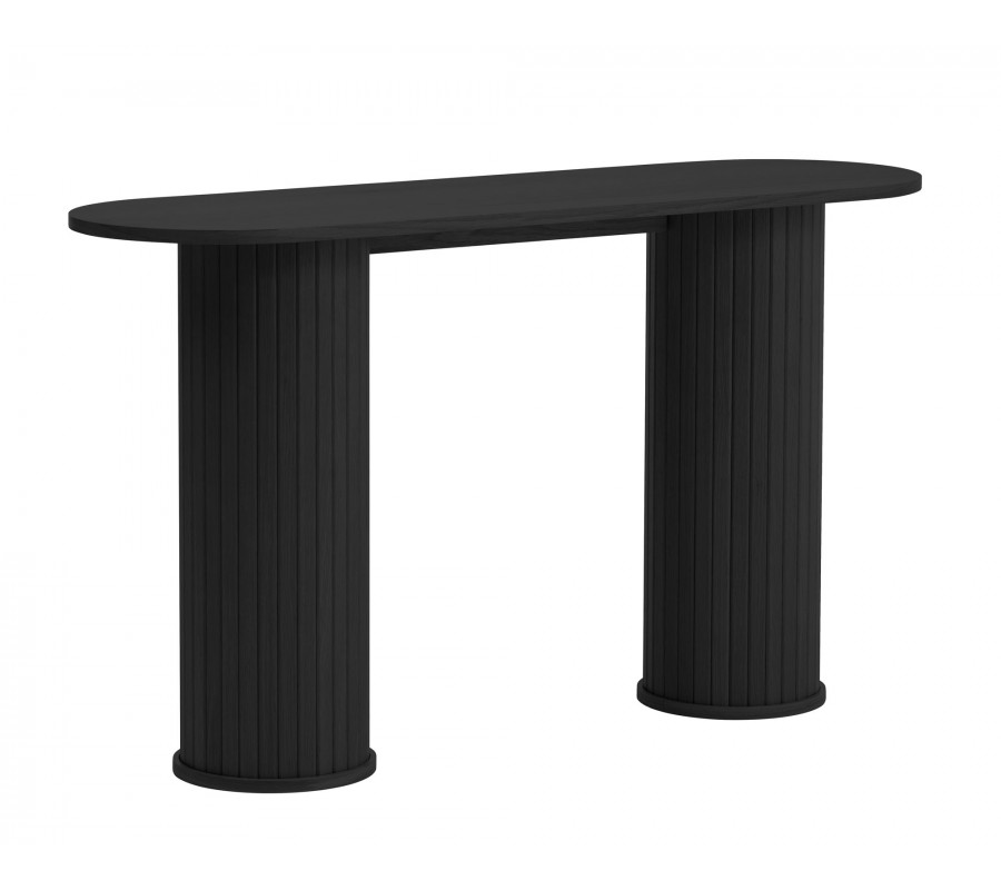 Moderní černý konzolový stolek Bornholm s hladkou oválnou vrchní deskou a dvěma mohutnýma nohama s lamelovým reliéfem 130 cm