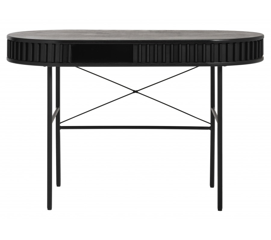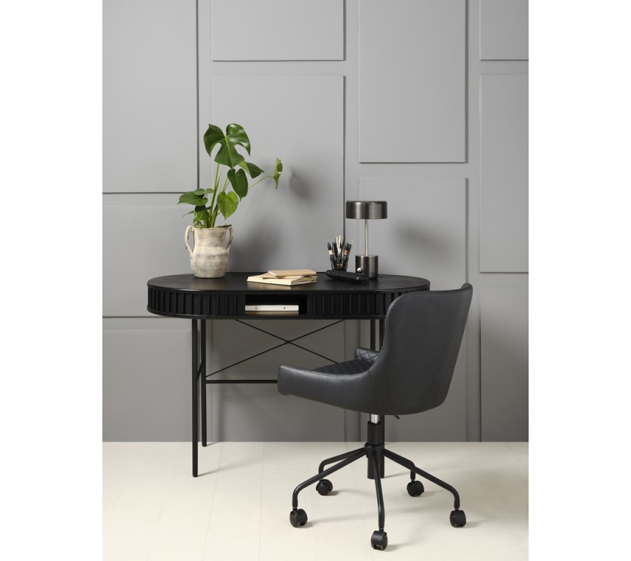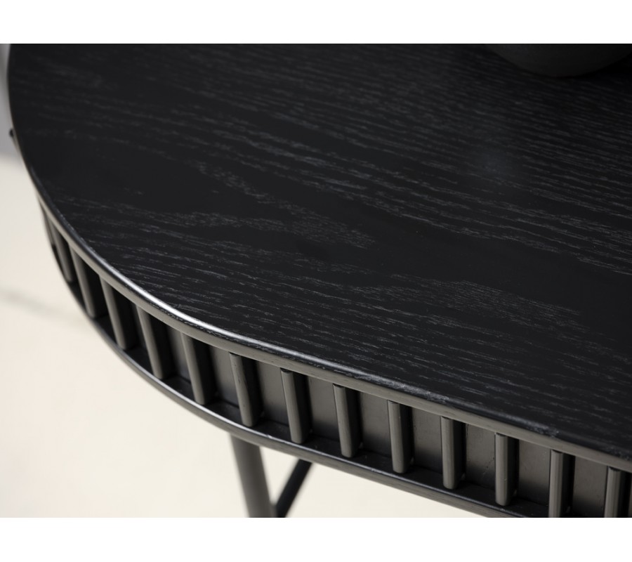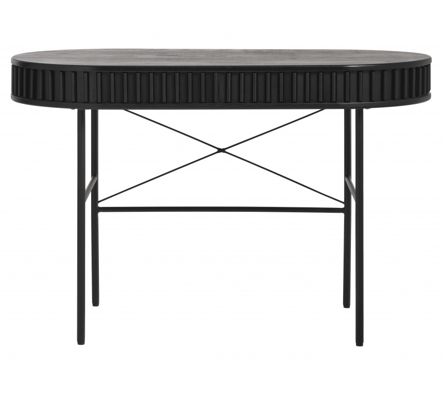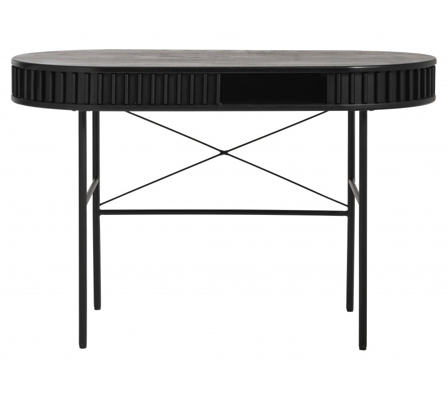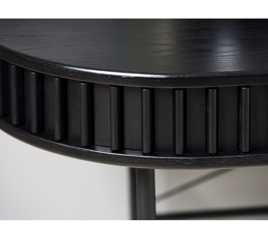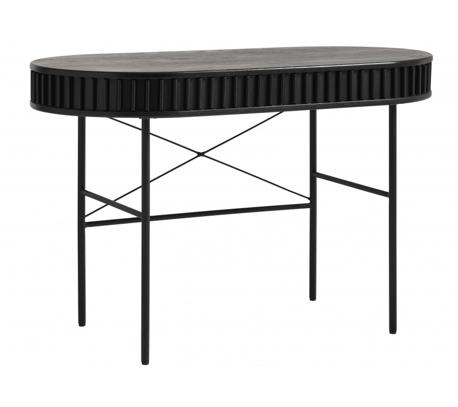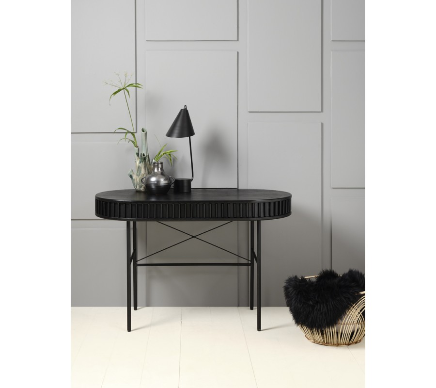 Luxusní psací oválný stolek Odense spojuje moderní design s jemnými art-deco prvky a výrazným tmavým provedením, které působí elegantně a nadčasově.