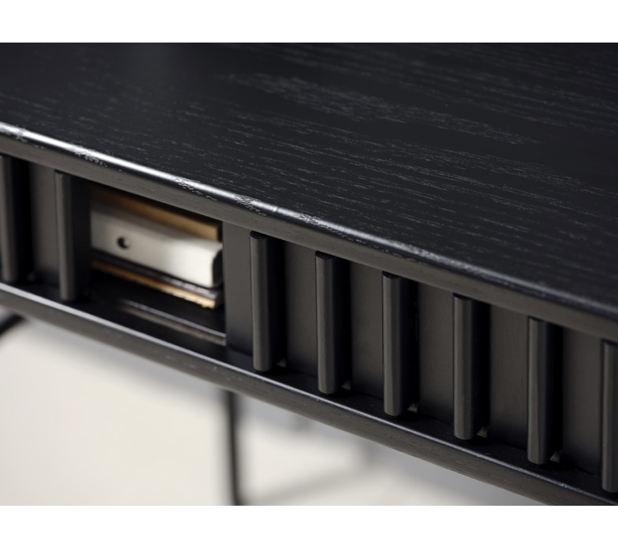 Vyhotoven je v černém provedení z kvalitních materiálů, jako masivní dub, dubová dýha a MDF. Psací stůl je vybaven úložným prostorem na menší předměty, které chcete mít po ruce, ale zároveň mimo dohled. Díky tomu si zachováte čistý a uklizený vzhled interiéru.
