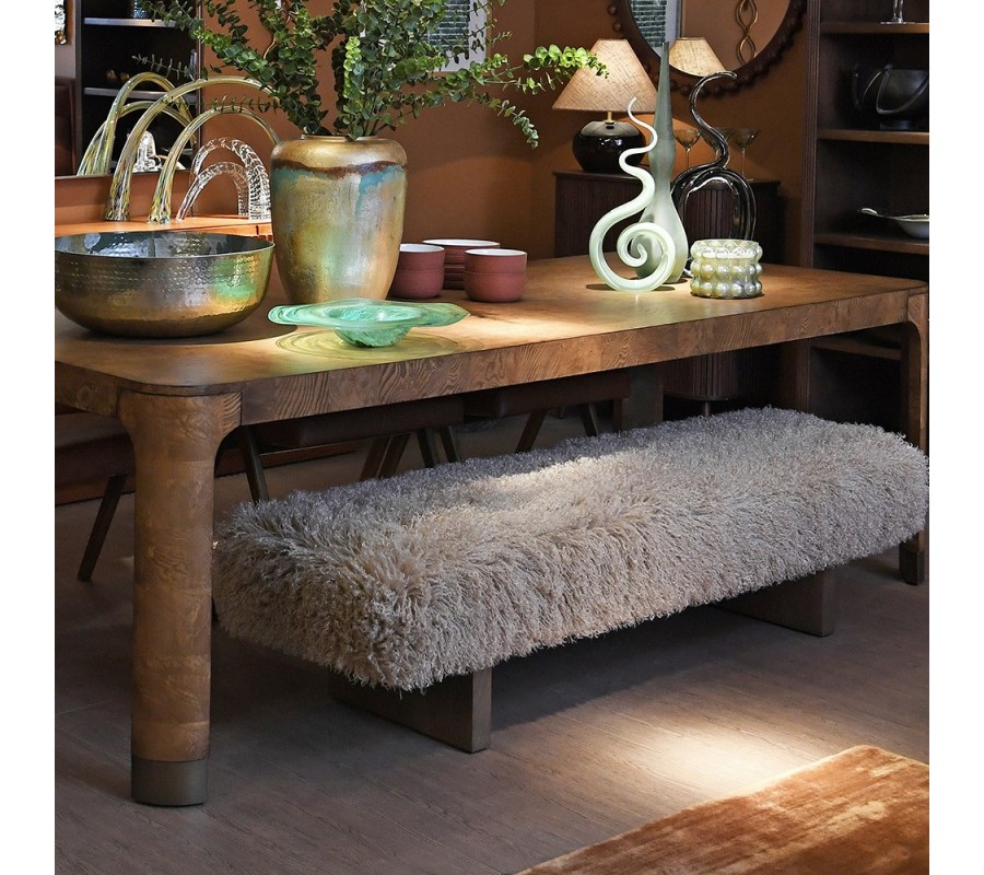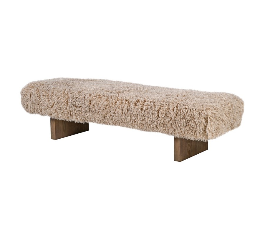 Sedadlo podpírají dvě ploché nohy z borovicového dřeva v hnědém provedení s výraznou kresbou dřeva, což lavici dodává stabilitu a přirozený kontrast k nadýchané kožešinové ploše.