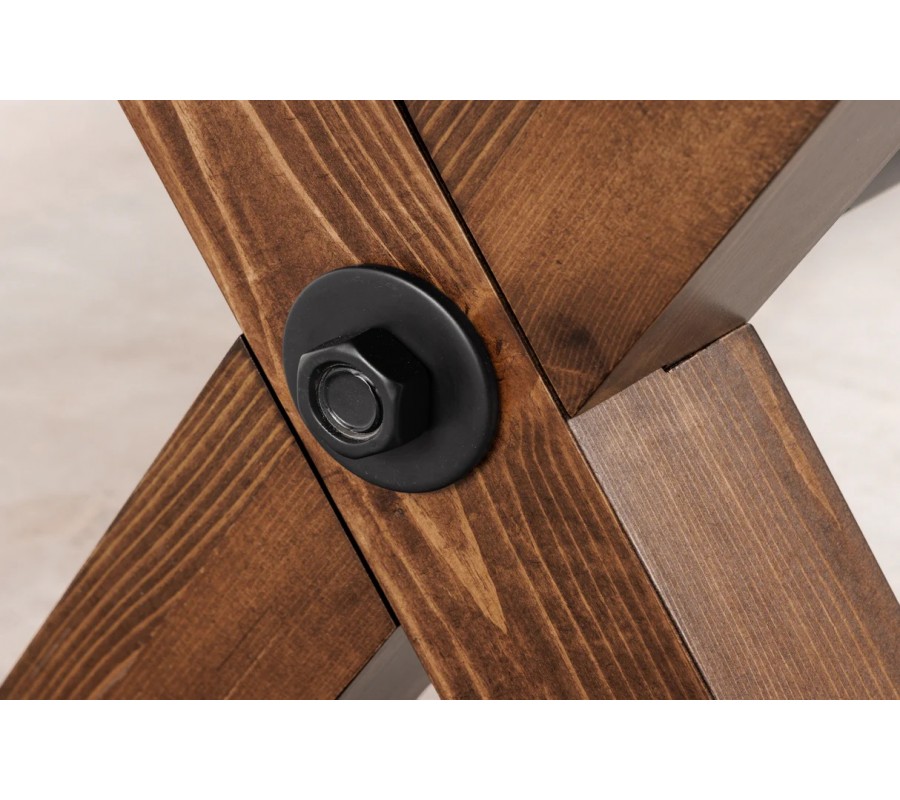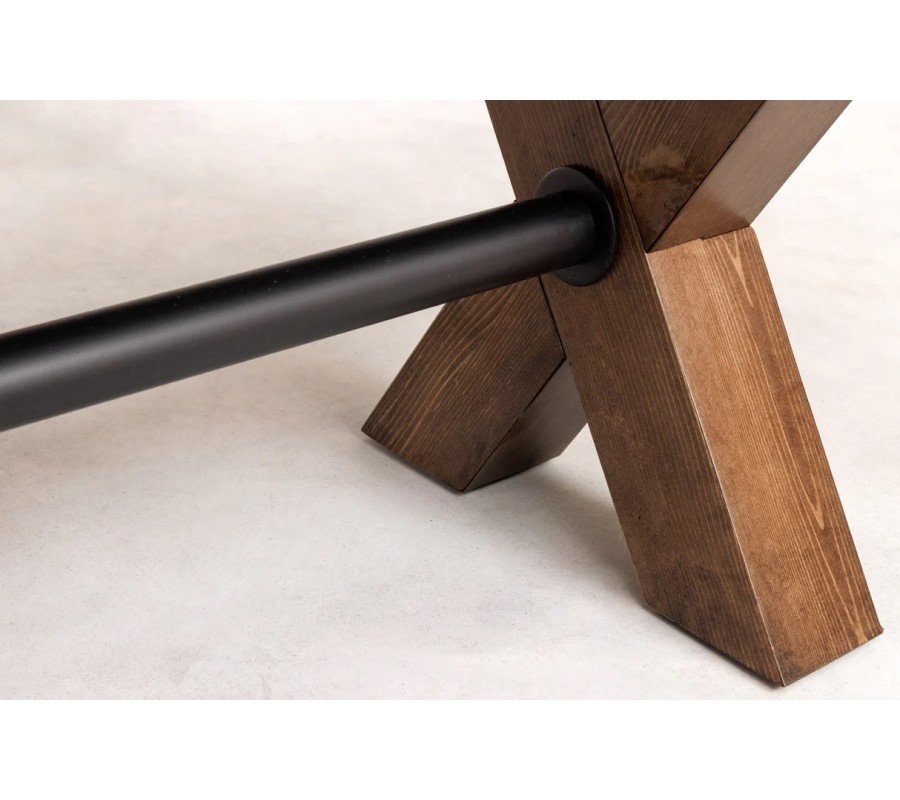 Lavice je vyrobena z kombinace masivního a dýhovaného dřeva v tmavším hnědém odstínu. Povrch doplňuje tmavá patina, která zdůrazňuje strukturu dřeva a dodává mu vintage rustikální vzhled. Výborně koresponduje i s černým kovovým provedením výztuhy mezi nožičkami.