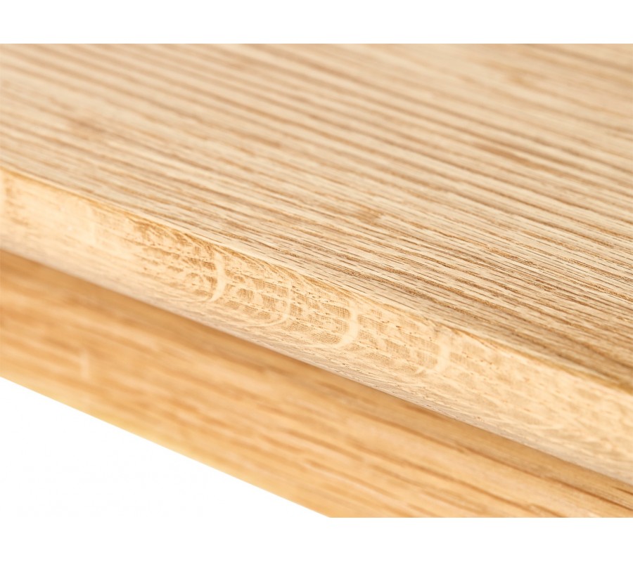 Lavice je vyrobena z dýhovaného dřeva v přírodním světlém hnědém dubovém provedení, které je typické pro skandinávský styl. Působí teplým a útulným dojmem. Povrch zdobí pravidelná kresba letokruhů a dodává nábytku výrazný přírodní charakter.