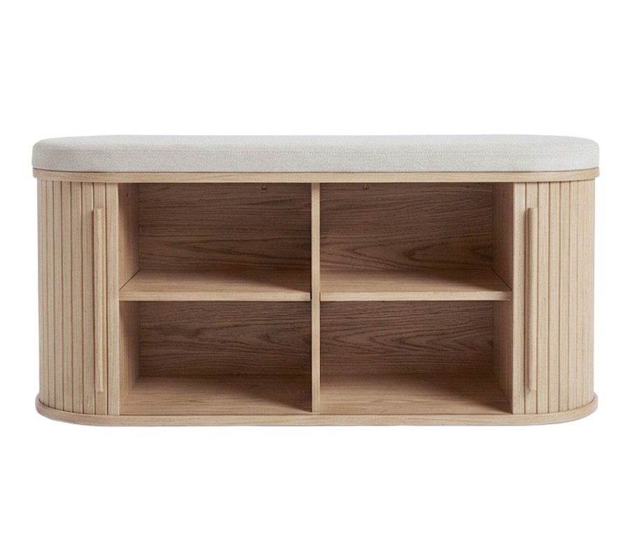 Korpus je vyroben z kombinace dubové dýhy a MDF, což zajišťuje pevnost i estetický vzhled. Provedení v přírodní světlé hnědé barvě zvýrazňuje přirozenou kresbu dubového dřeva a dodává nábytku teplý vizuál. Po celém obvodu lavice se nachází vertikální lamelové zdobení, do kterého jsou nenápadně zasazena dvojitá posuvná dvířka s jednoduchými válcovitými úchyty, odkazujícími na retro styl. Vnitřní prostor je rozdělen na čtyři stejné police uspořádané ve dvou řadách.
