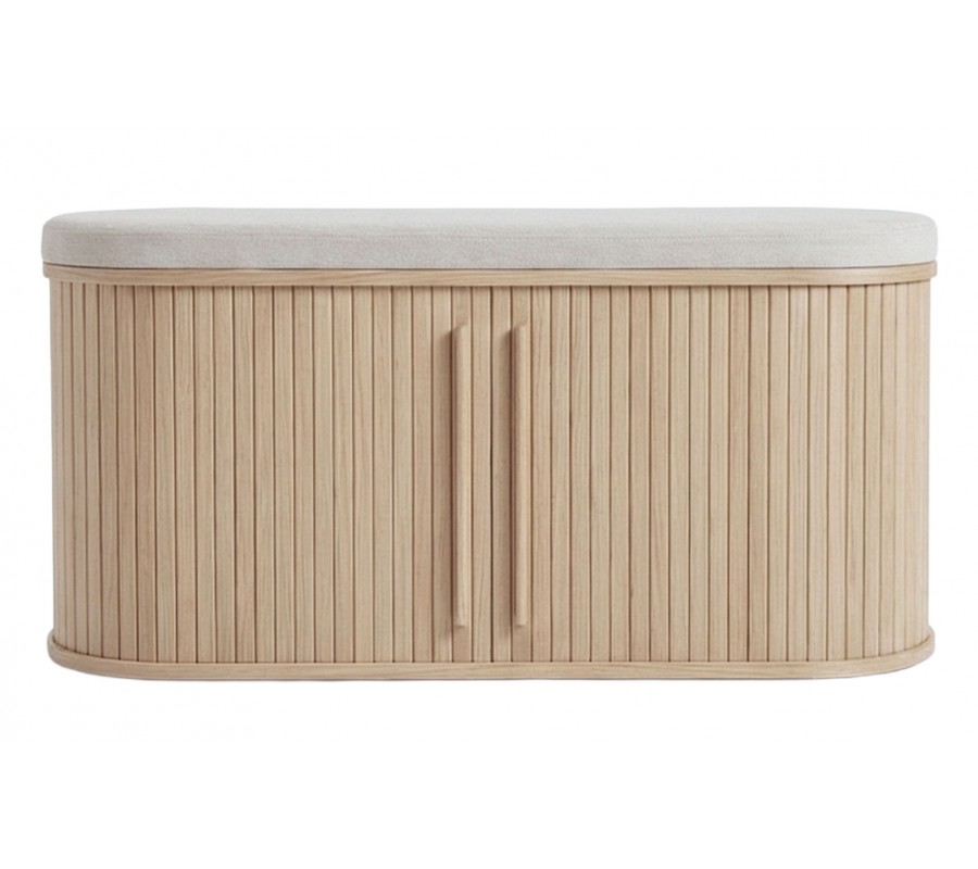 Skandinávská oválná světlá hnědá dubová lavice Alborg s úložným prostorem s posuvnými dvířky a čalouněným sedadlem 120 cm