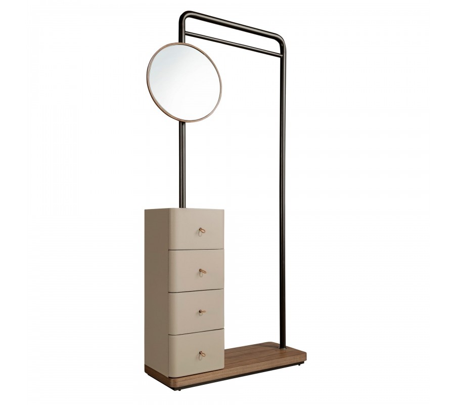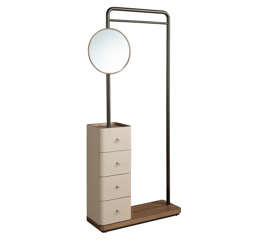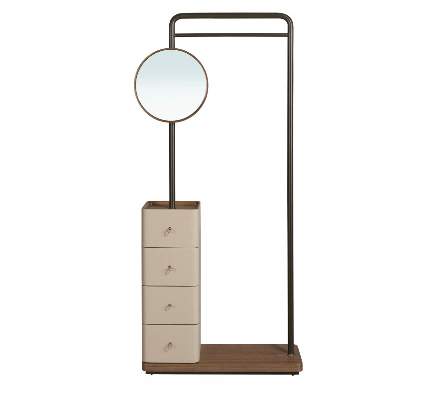 Vysoký obdélníkový kovový rám se připojuje na jedné straně k podstavě a na druhé k vrchní části úložného prostoru. Má válcovitý profil se zaoblenými rohy a v jeho vrchní části je upevněna závěsná tyč na ramínka. Nad úložným prostorem je zase k rámu upevněno kulaté zrcadlo o průměru 40 cm. Rám je vyroben z kvalitní nerezové oceli v tmavém šedém provedení.
