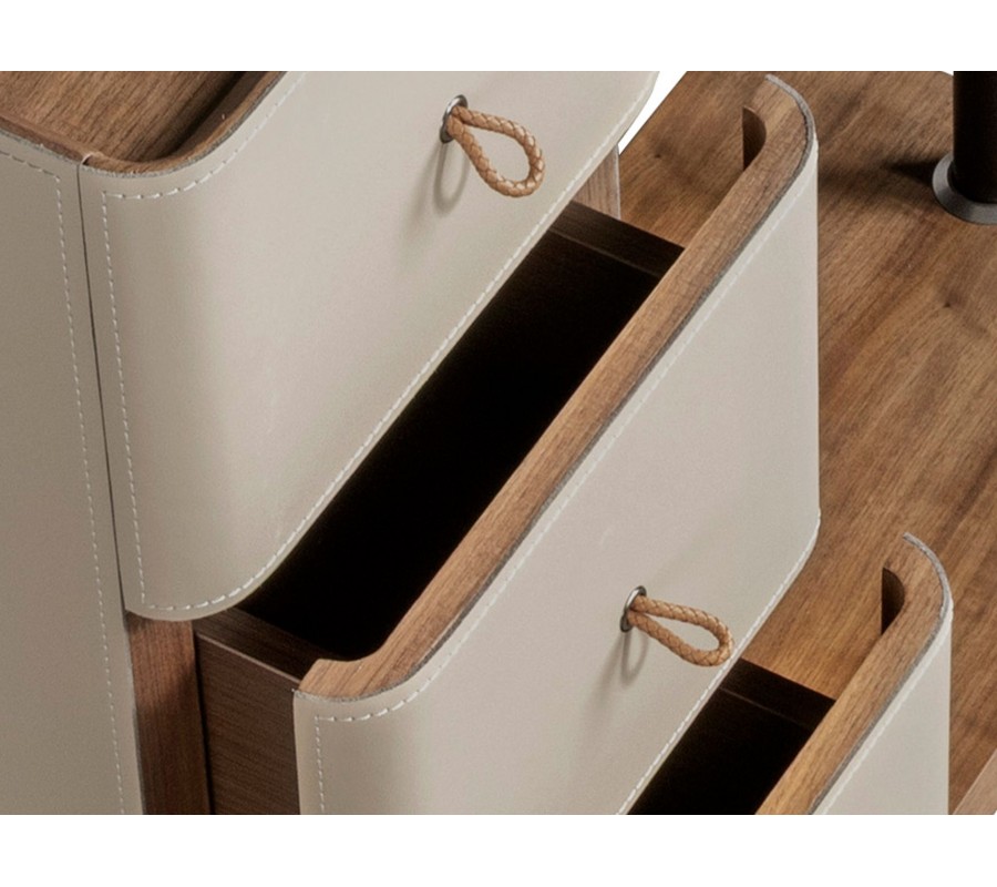 Třetinu podstavy zabírá úložný prostor v podobě čtyř nad sebou umístěných zásuvek o velikosti 18x22 cm. Spodní tři mají výšku 14 cm, zatímco vrchní je nižší, s výškou 11 cm. Jsou vyrobeny ze stejné ořechové dýhy jako podstava a boční strany pokrývá hladký potah z pravé kůže v norkové béžové barvě. Na každé zásuvce je umístěna malá úchytka v podobě smyčky ze zaplétané kůže v kontrastním hnědém odstínu. Vrchní část zásuvek má vyvýšený okraj a poslouží tak jako praktický odkládací prostor na klíče či jiné drobnosti.