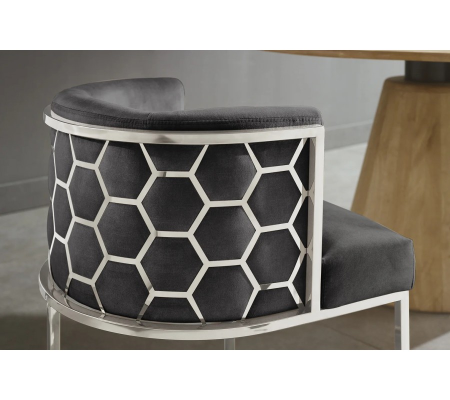 Art deco jídelní židle Leara s šedým sametovým potahem a stříbrnou kovovou konstrukcí se vzorem medového plátu 75 cm