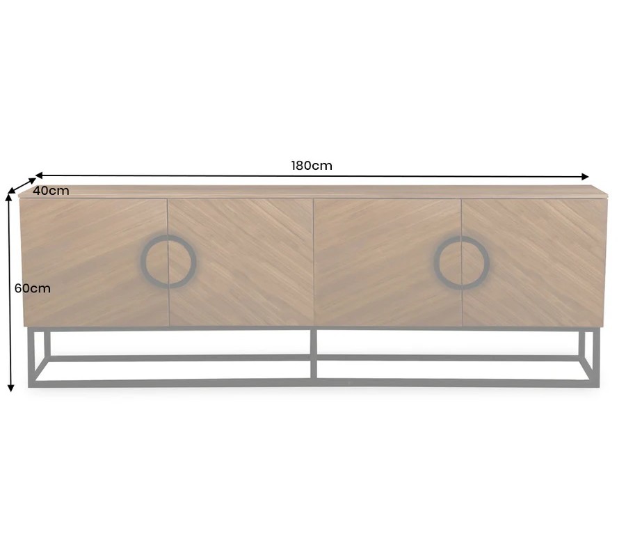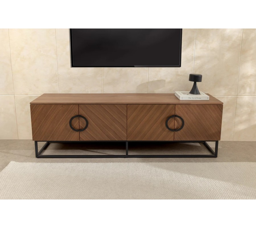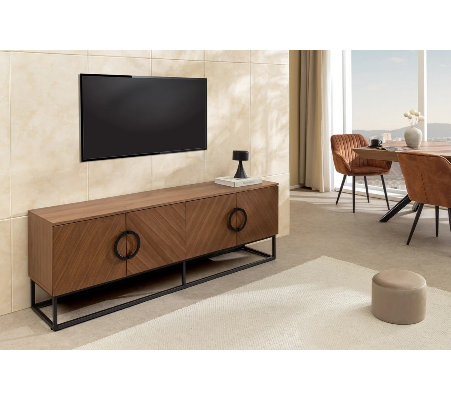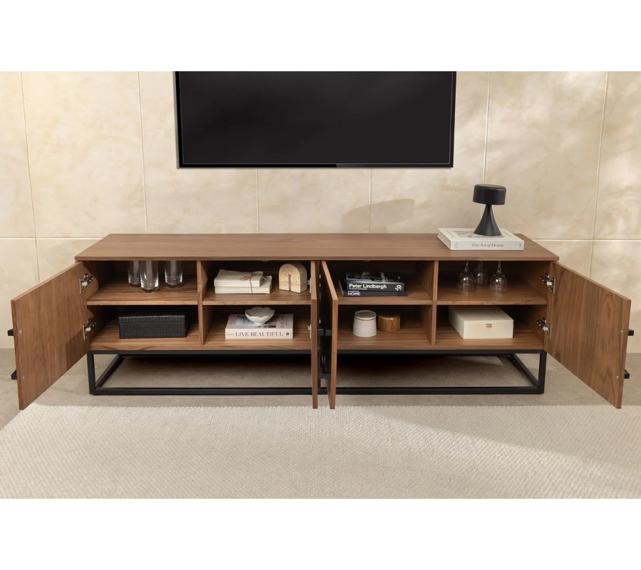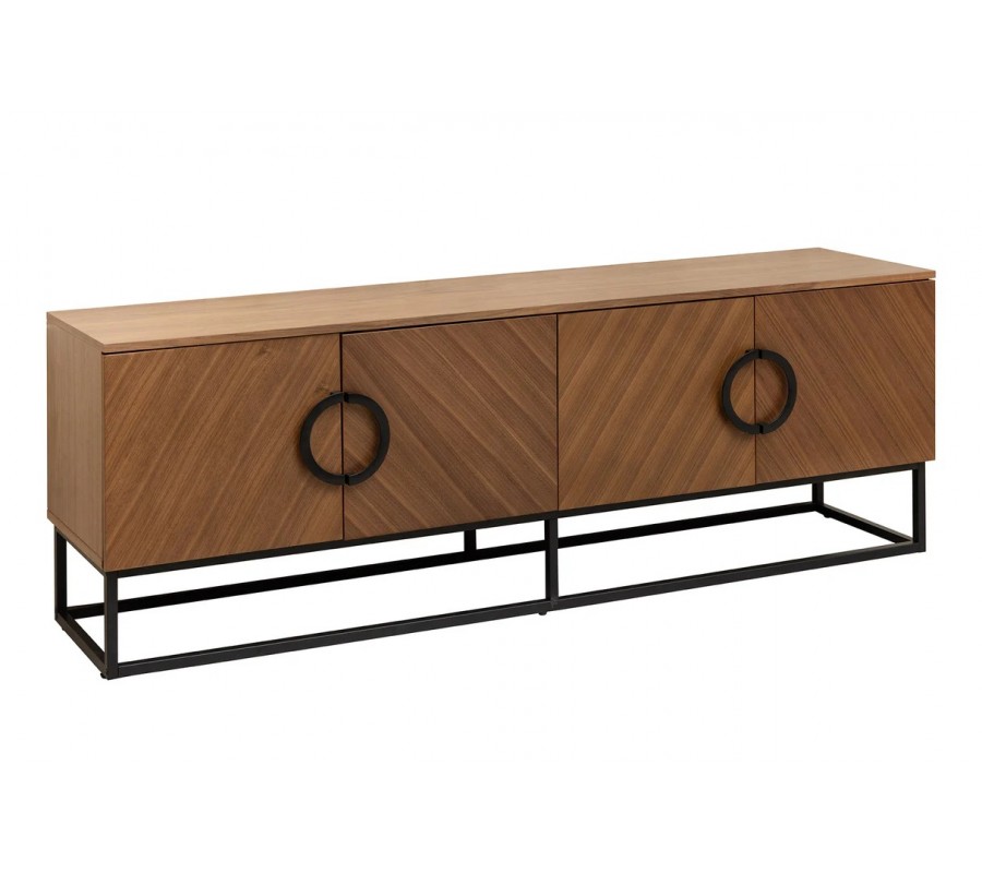 Designový art deco čtyřdveřový TV stolek Arkline ve světlém hnědém orechovém provedení s černými kovovými detaily 180 cm