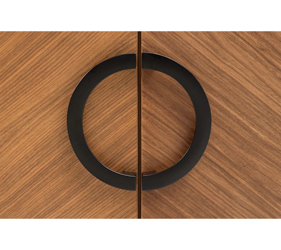 Design dvířek výborně doplňují úchytky, které se na každých dvířkách spojují do kružnice a vytvářejí tak elegantní geometrický art deco prvek. Jsou vyrobeny z kovu v matné černé barvě, stejně jako podstava.