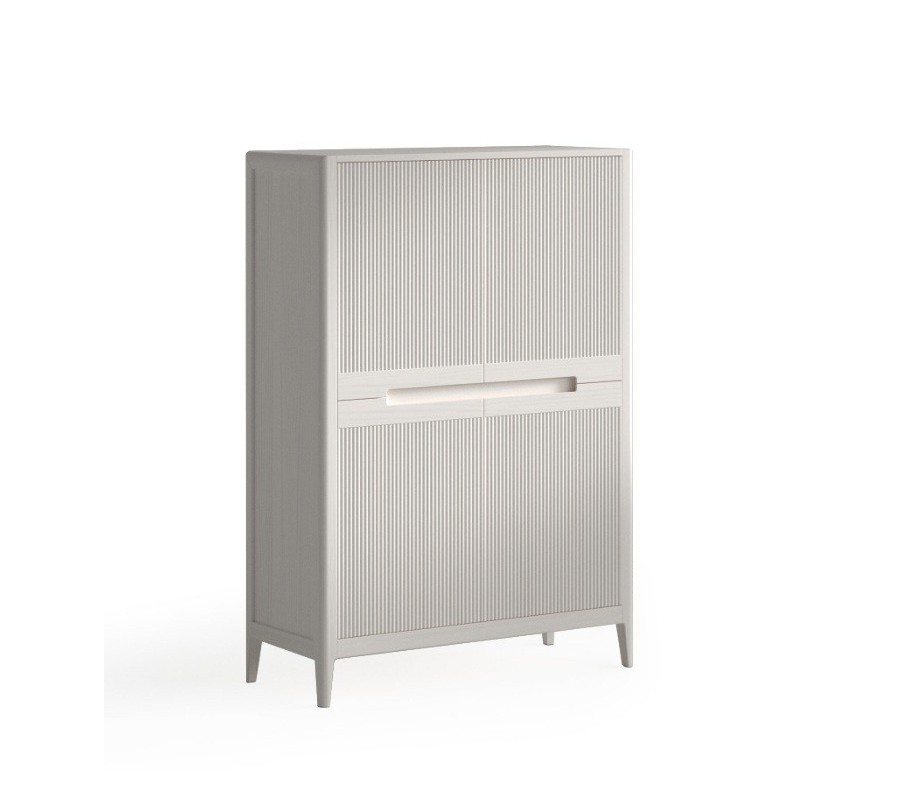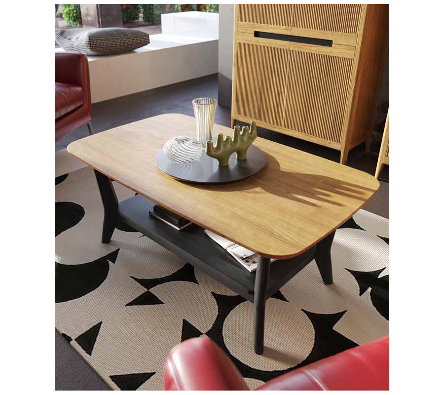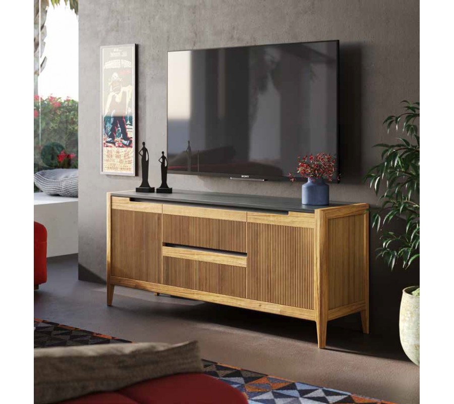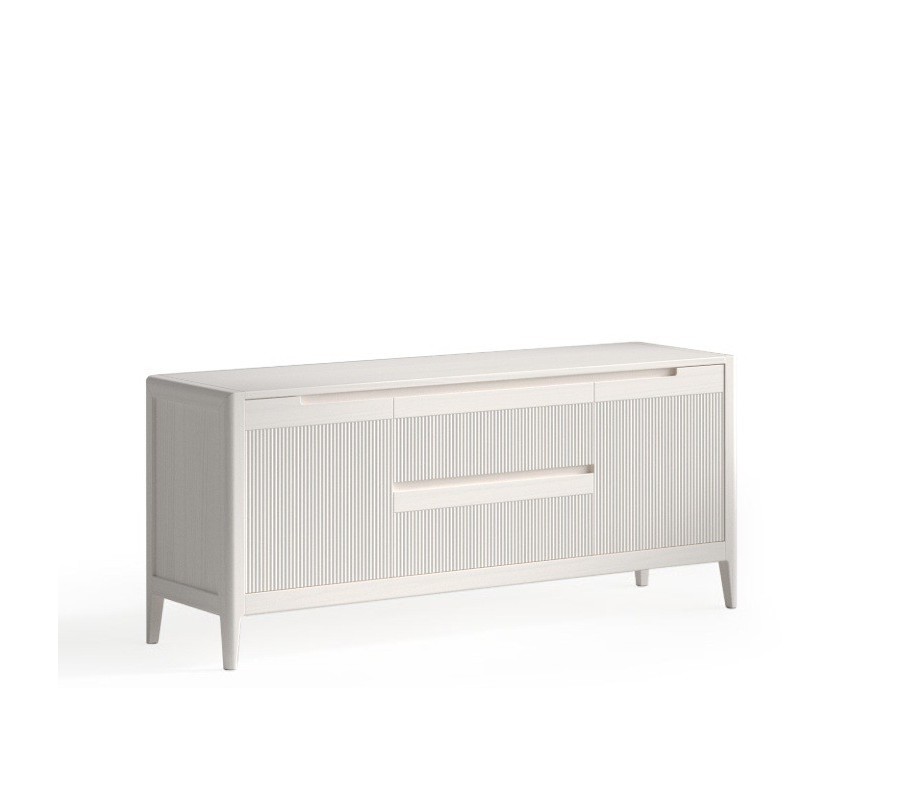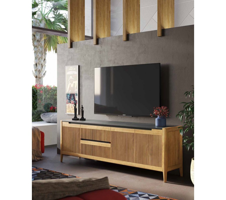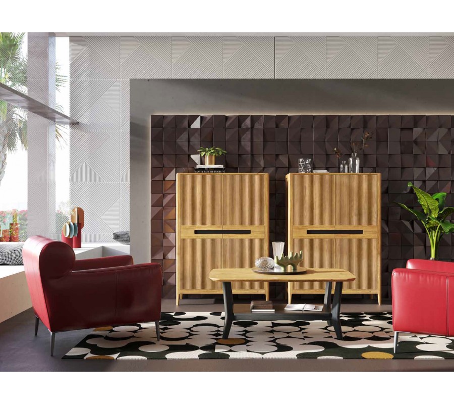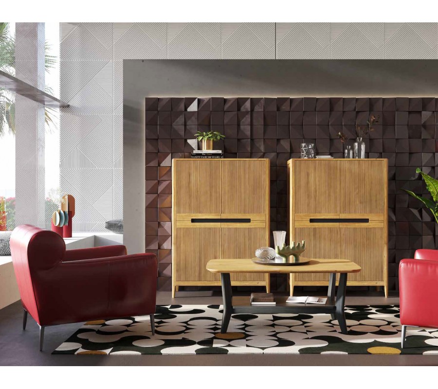 V centru sestavy se nachází obdélníkový konferenční stolek s praktickou policí, dostupný ve dvou rozměrech. Mramorová deska dodá prostoru luxusní akcent a zaoblené rohy a prohnuté nožičky vytváří elegantní siluetu. Bohatý úložný prostor poskytne vysoká čtyřdveřová barová skříňka a dvoudveřový nebo třídveřový televizní stolek se dvěma šuplíky. Nábytek vizuálně propojuje elegantní vertikální žebrovaný reliéf na fasádách, který přinese do obýváku stylem.