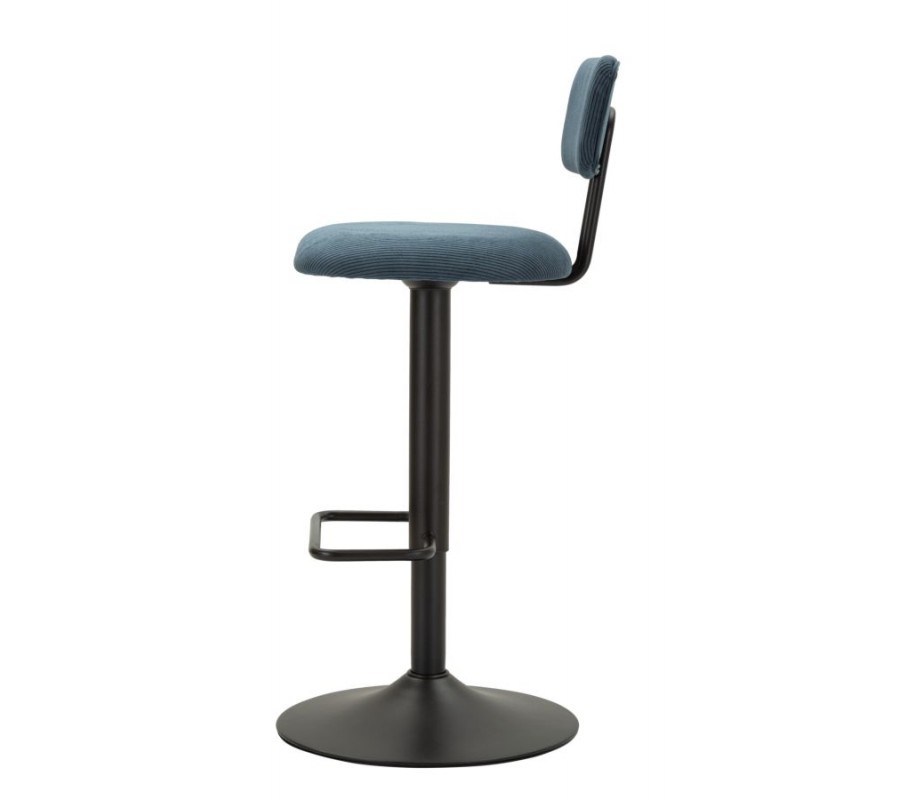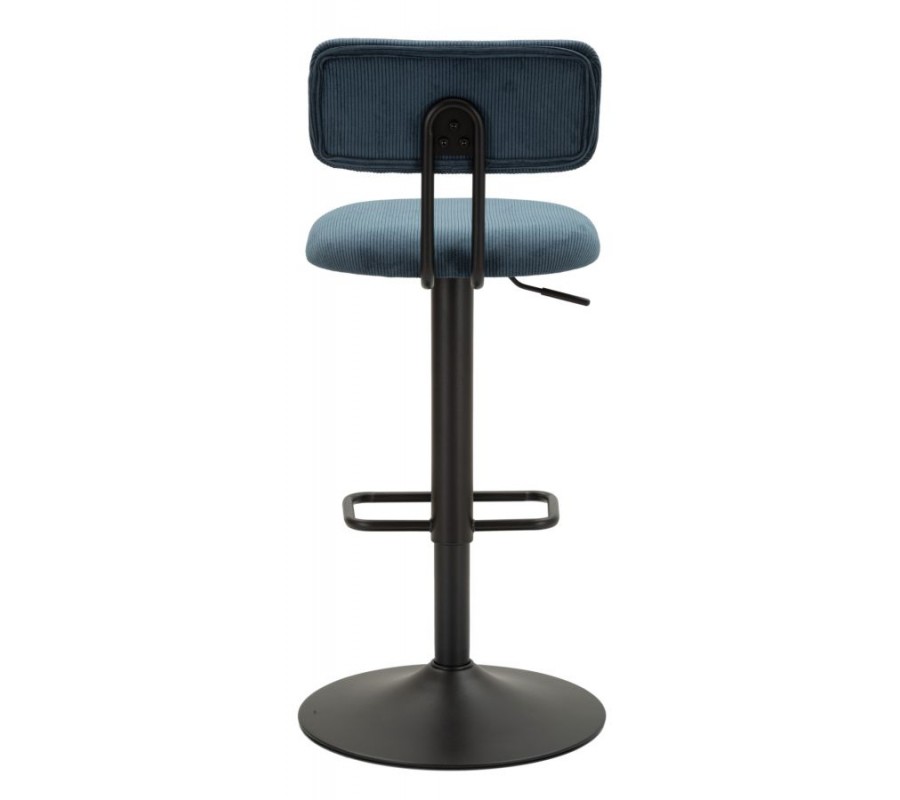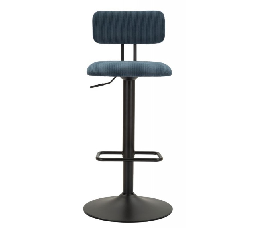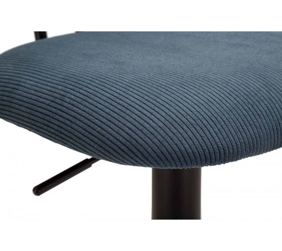 Moderní barová židle Nairo s manšestrovým potahem v tmavě modré barvě a výškově nastavitelnou kovovou konstrukcí 106 cm