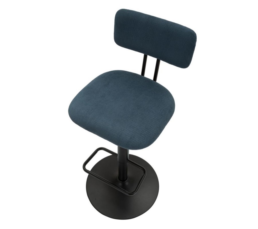 Barová židle Nairo přináší moderní design spojený s maximálním komfortem. Sedadlo a opěradlo jsou potaženy manšestrovou látkou v tmavě modré barvě, která nejenže působí vizuálně atraktivní, ale zároveň dodává povrchu jemnou texturu a příjemný pocit při sezení.