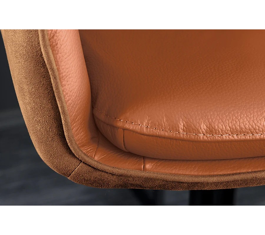 Vnější potah židle tvoří samet ve stejném hnědém barevném odstínu, kontrast mezi hladkou kůží a jemnou texturou sametu podtrhuje originální design židle. Celé sedátko je otočné o 360 stupňů, což zajišťuje flexibilitu a pohodlí u kuchyňského pultu nebo barového stolu.