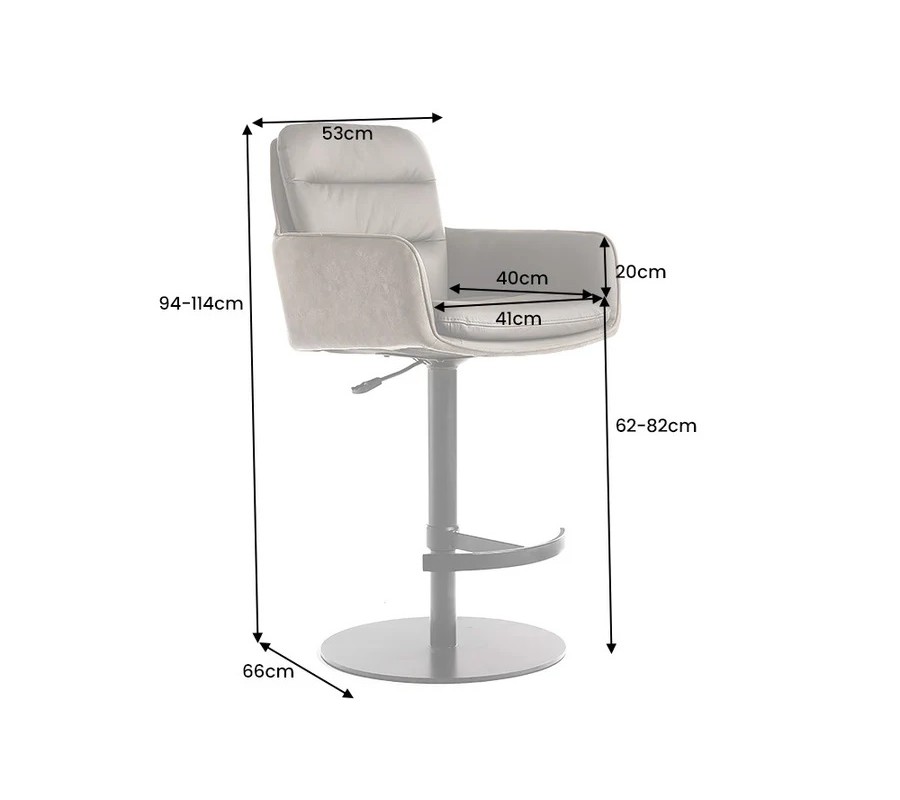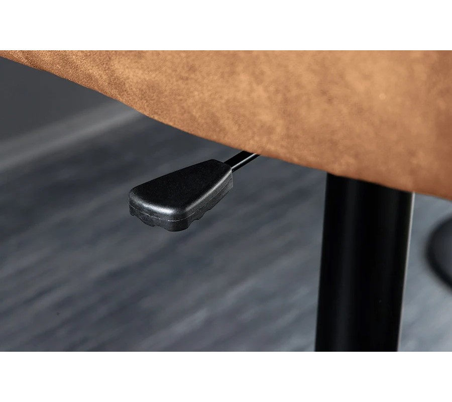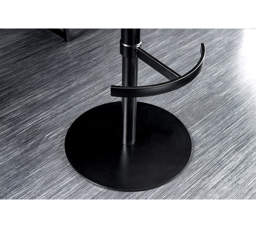 stolička je vybavena plynovým pístem s páčkou pod sedadlem, díky které si lze nastavit výšku podle potřeby a to od 95-115 cm. Stabilitu zajišťuje kovová noha v černé barvě, zakončená kulatým podstavcem, která působí elegantně a zároveň tvoří nápaditý detail v industriálním stylu. Komfort při delším sezení zvyšuje opěrka na nohy ve tvaru kotvy.