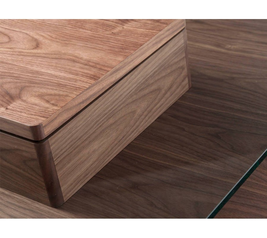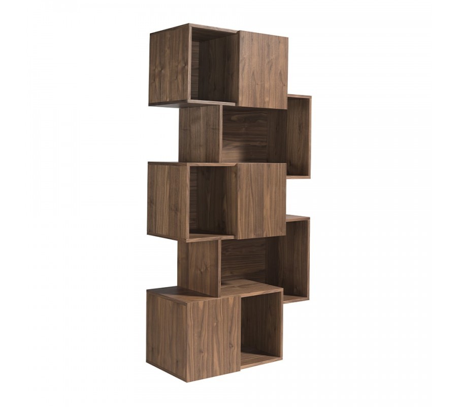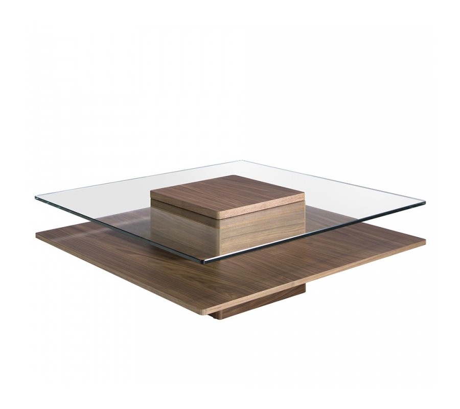 Konferenční stolek a knihovna s kombinovatelným otevřeným a uzavřeným úložným prostorem zaujmou svými originálními siluetami, ve kterých dominují striktní rovné linie a pravé úhly. Vrchní deska stolku z průhledného bezpečnostního skla zdůrazňuje moderní charakter a nechává vyniknout originální tvar nábytku. Police a skříňky knihovny v asymetrickém uspořádání zase umožňují efektní vystavení vašich oblíbených knih či dekorací.