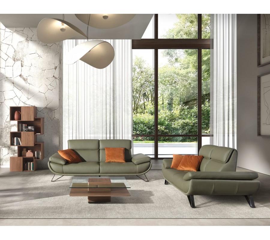 Základem sestavy jsou dvousedačka a trojsedačka s potahem z pravé kůže v olivově zeleném odstínu. Jsou nejen vizuálně atraktivní, ale díky polohovatelné opěrce i mimořádně komfortní. Tento svěží barevný akcent výborně doplňuje ořechové hnědé dřevo se subtilní kresbou letokruhů. Do místnosti přinese naturální prvek a pocit tepla.