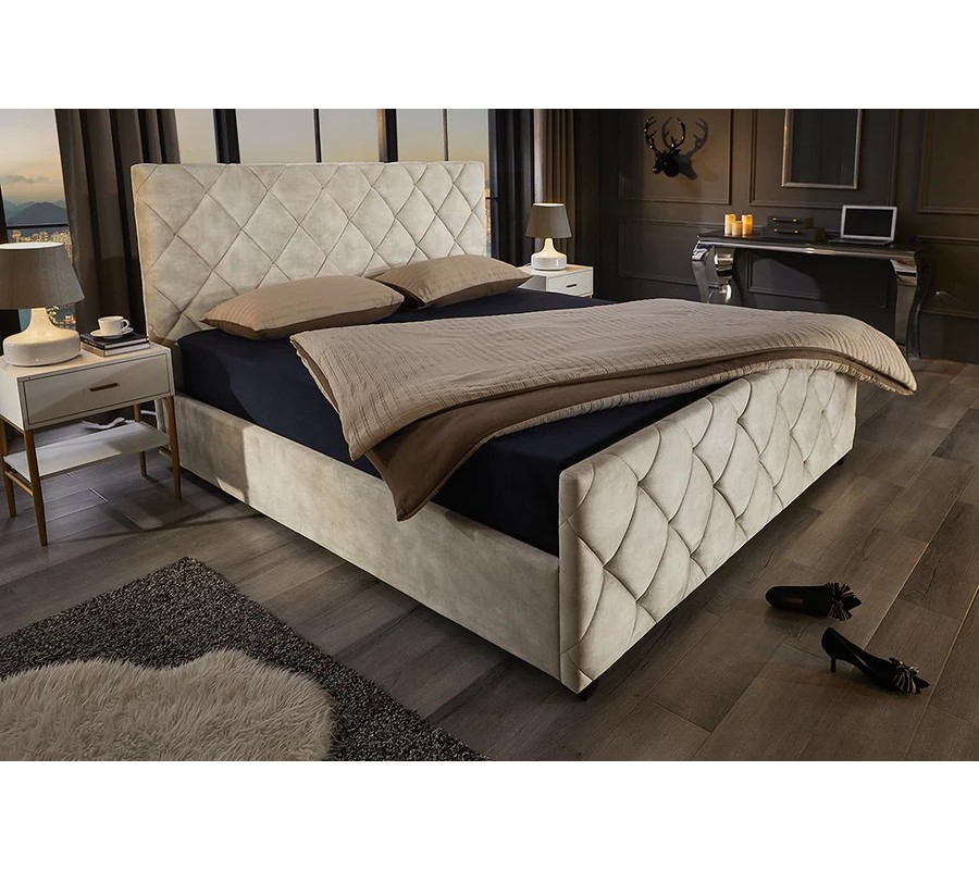 Designová moderní manželská postel Angelica s úložným prostorem a béžovým sametovým potahem s diamantovým prošíváním 190 cm