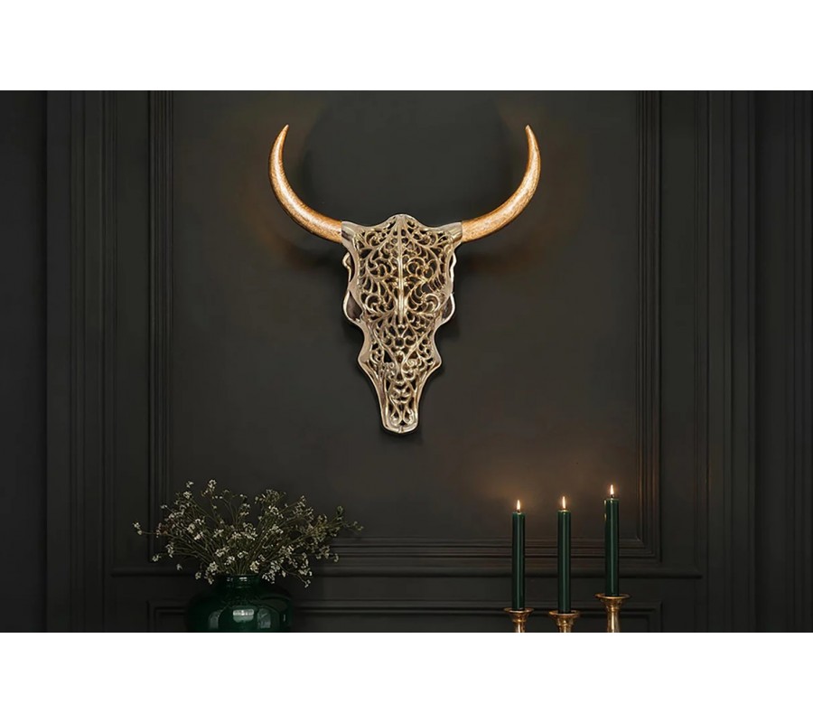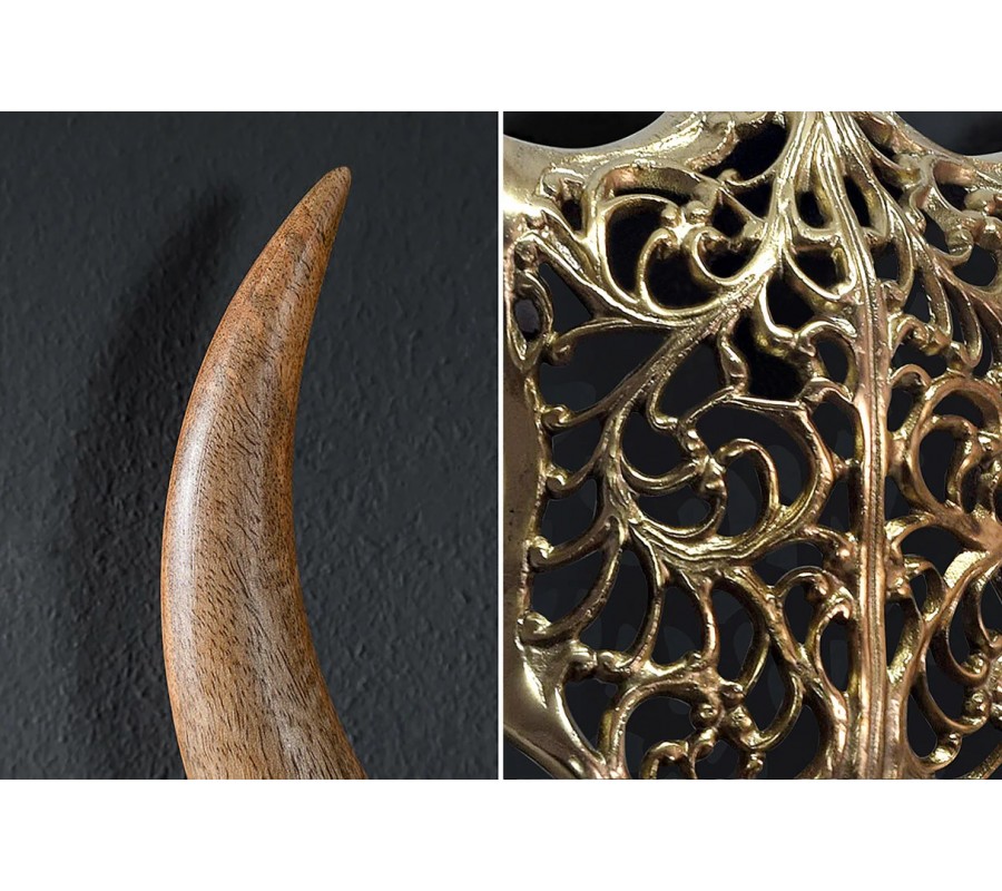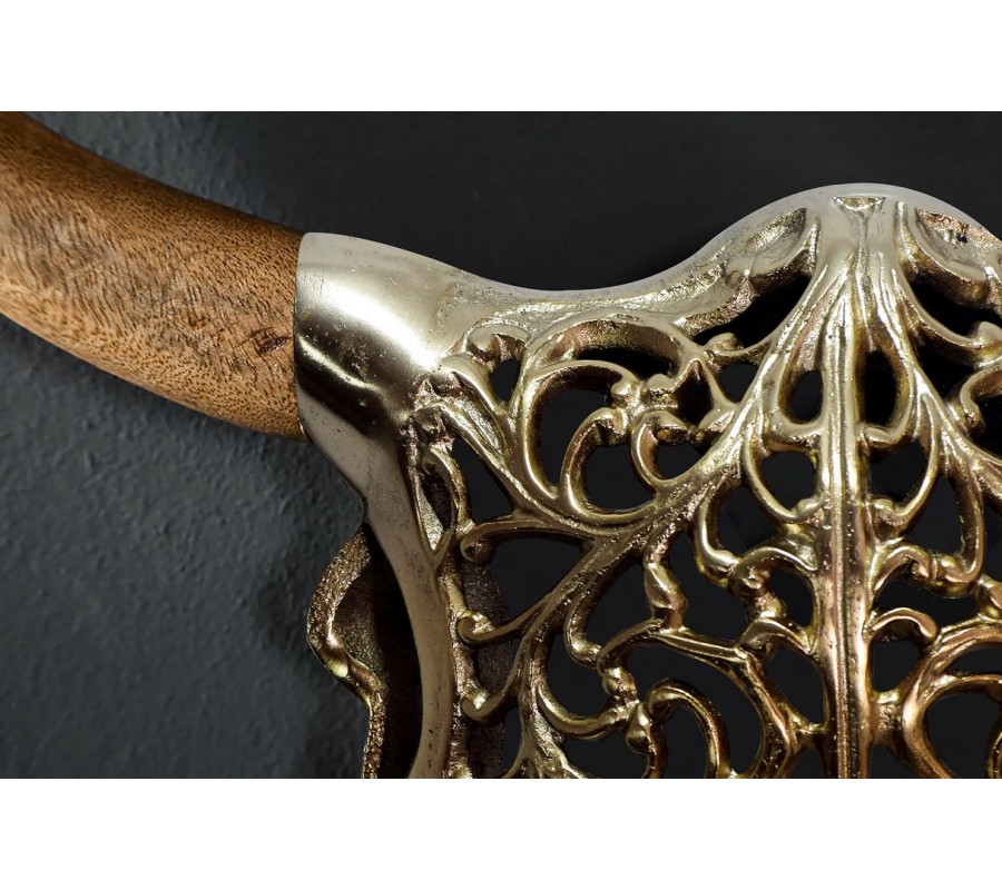 Dekorace je vyrobena z kovu a má siluetu býčí lebky. Její tvar je symetrický a zjednodušený, což působí moderním dojmem. Hrubší okraje vyplňuje delikátní ornamentální vzor s florálními motivy, inspirovaný orientálním stylem. Provedení ve zlaté barvě dotváří exkluzivní vizuál a výborně s ním koresponduje teplá hnědá barva mangového dřeva, ze kterého jsou vyrobeny mohutné zahnuté rohy. Jejich povrch je hladký, se zachovanou strukturou dřeva. Ruční zpracování dodává každému kusu unikátní charakter.