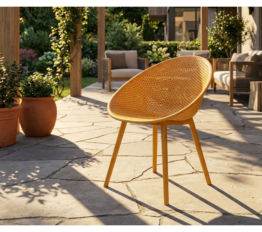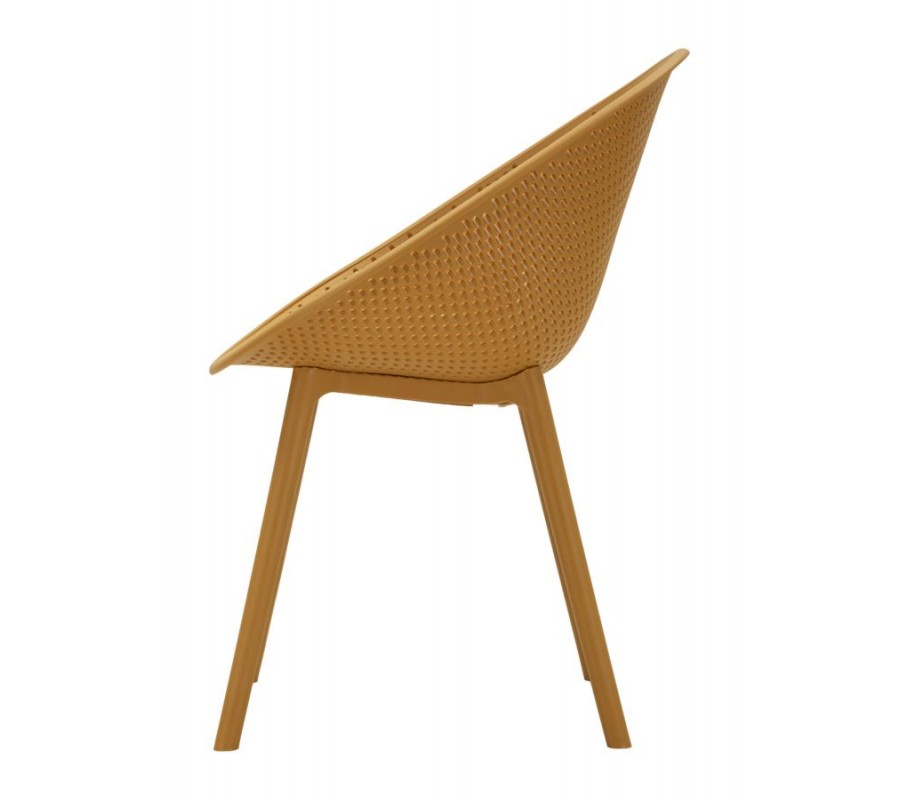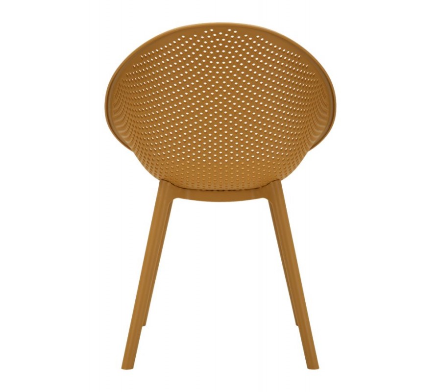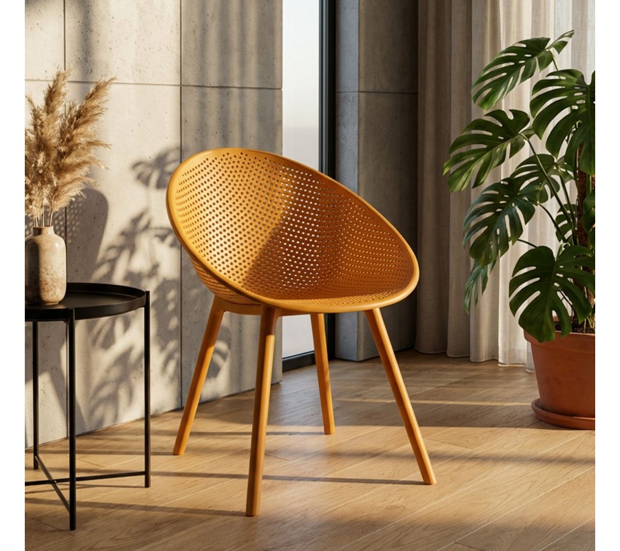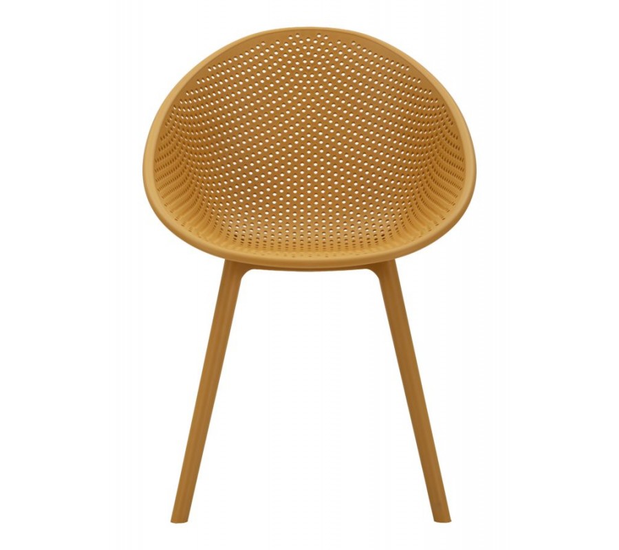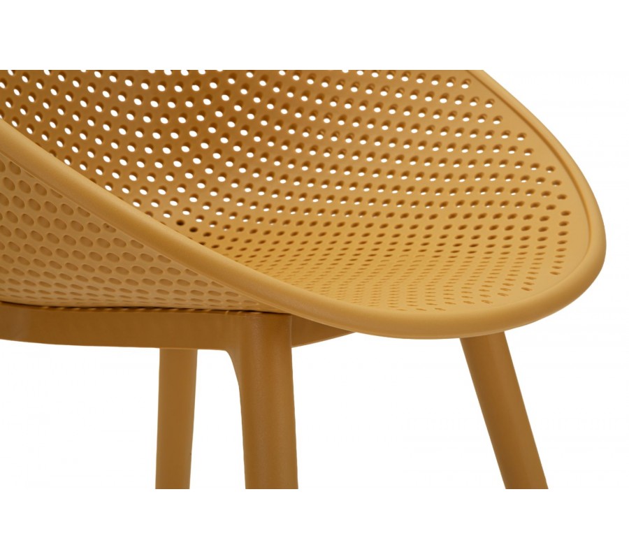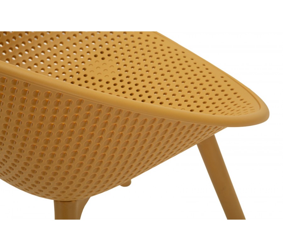 Konstrukci podpírají čtyři válcovité nohy, mírně zešikmené směrem ven, což zaručuje výbornou stabilitu. V horní části jsou propojeny čtvercovým rámem, který je v rozích jemně vyvýšený a přizpůsobený oblému tvaru sedáku, čímž podtrhuje elegantní charakter celého designu. Židle je vyhotovena z odolného plastu v sytém žlutém odstínu, který zvýrazňuje její moderní zpracování.