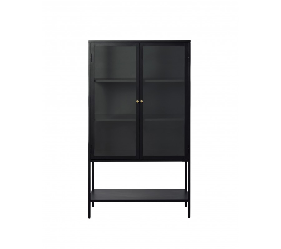 Konstrukce kombinuje odolný kov s bezpečnostním sklem, což zaručuje pevnos, vizuální lehkost a jemně industriální výraz. Matný černý povrch zvýrazňuje čisté linie skříňky a podtrhuje její moderní charakter. Lesklé zlaté detaily v podobě kulatých úchytek působí jako decentní akcentový prvek.