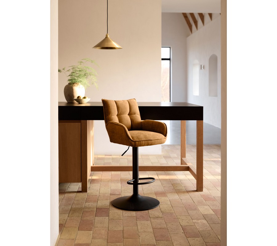 Barová židle Laerke vás okouzlí svým moderním designem s industriálními prvky a nádechem skandinávského stylu. Rezavě oranžová barva potahu působí teplým dojmem a oceníte také nastavitelnou nohu, pomocí které si můžete přizpůsobit výšku sedu v rozmezí od 67 do 82 cm.