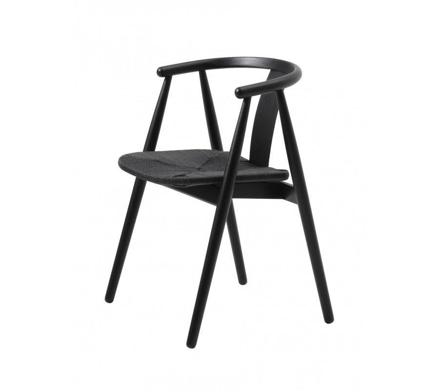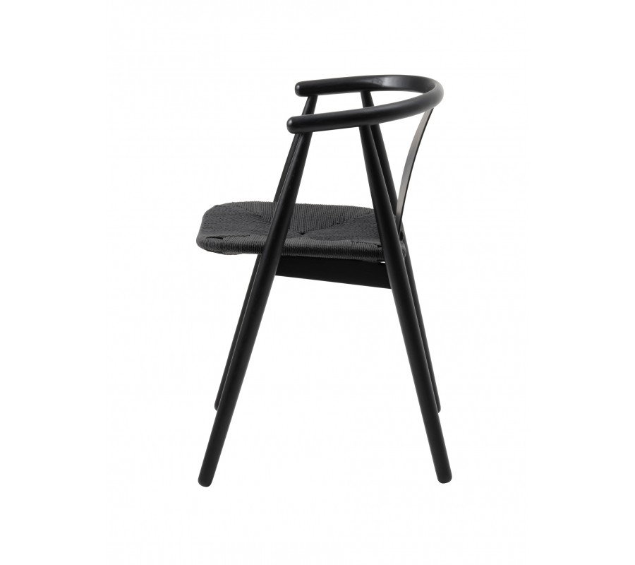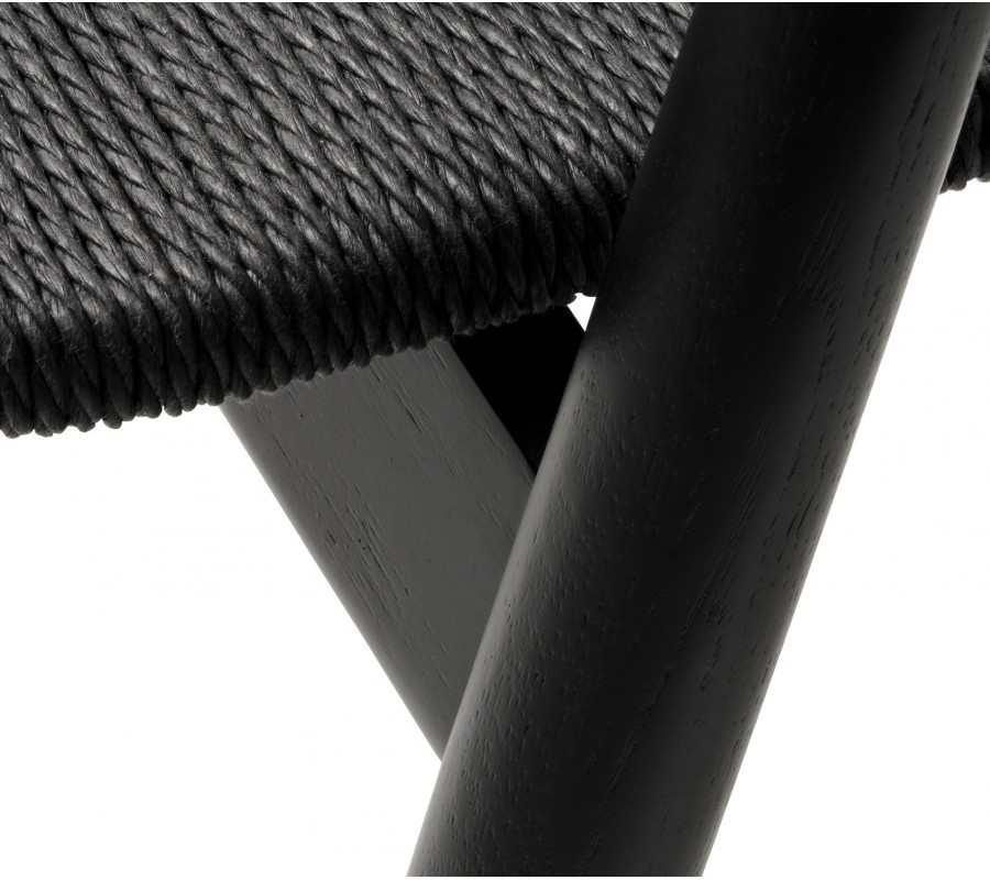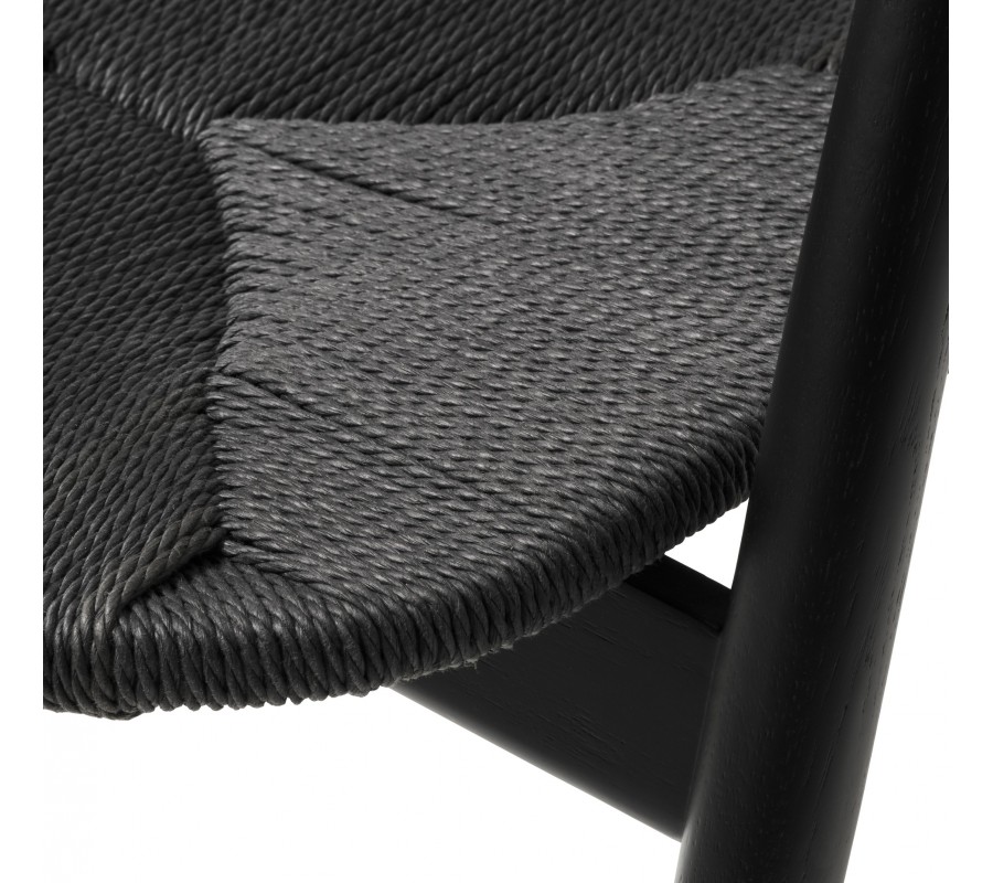 stolička má konstrukci vyrobenou z masivního dubového dřeva, které jí zaručuje vysokou odolnost i při intenzivním každodenním používání. Sedadlo doplňuje výplet z pevného papírového kordu - přírodního vlákna, známého svojí dlouhou životností, který patří mezi populární materiály ve skandinávském designu. Provedení v černé barvě zachovává viditelnoustrukturu dřeva i naturální charakter výpletu a dodává tak židli hřejivý severský výraz.