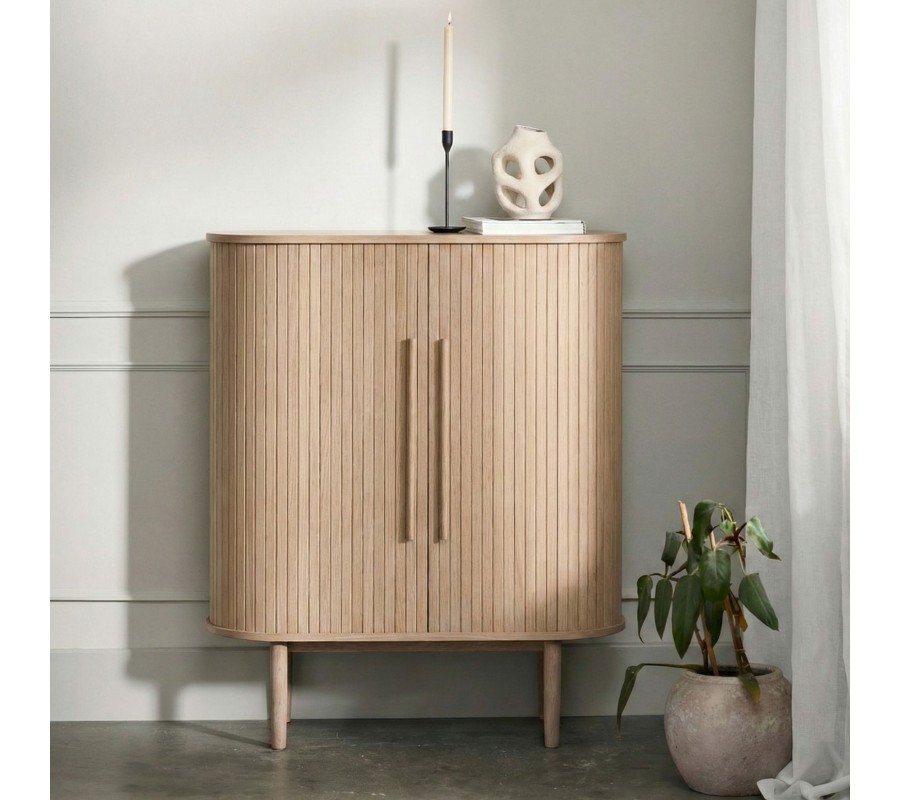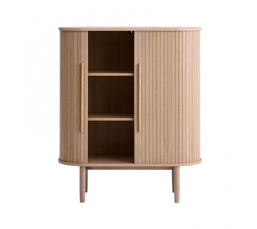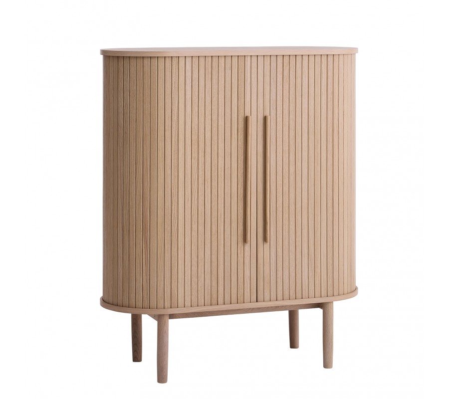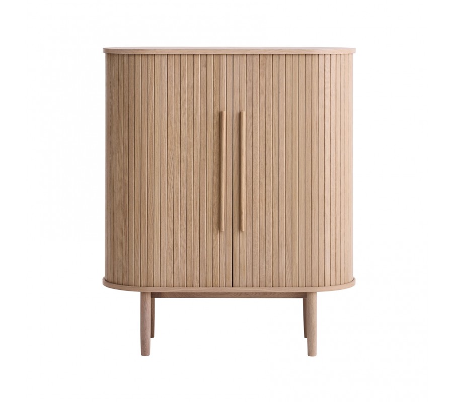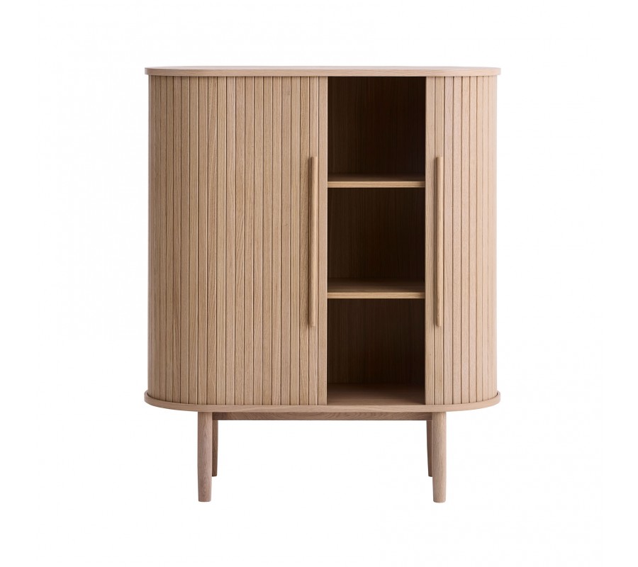 Škandinávska oválna barová skrinka Alborg s dvojitými posuvnými dvierkami v svetlom hnedom dubovom prevedení 118 cm