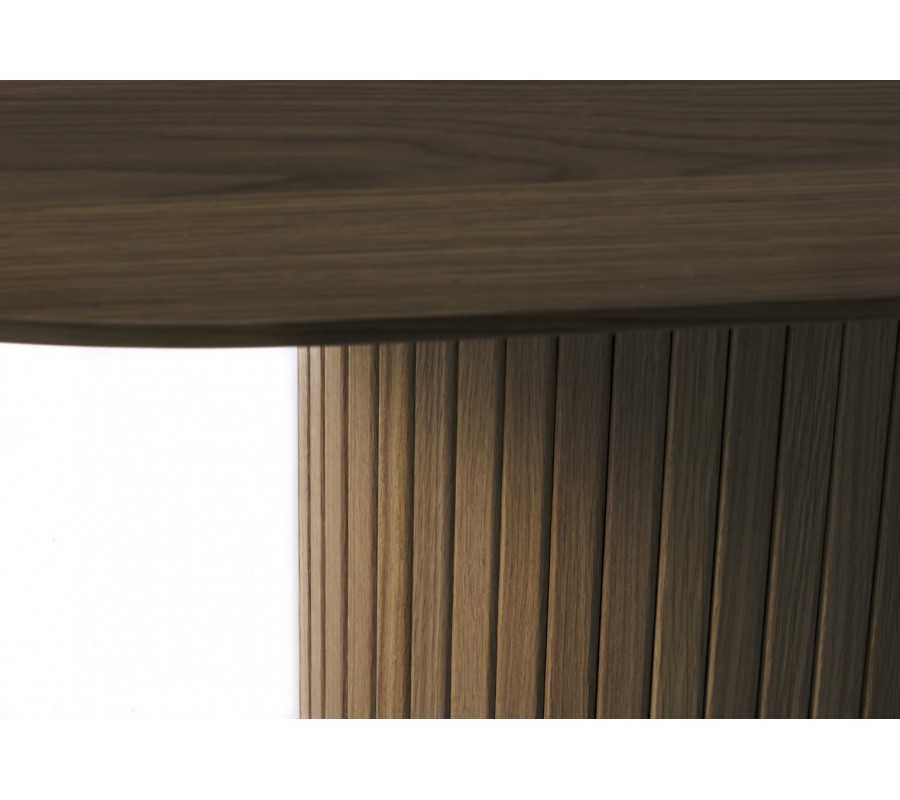 Konstrukce je vyrobena z kombinace MDF a pravé dubové dýhy. Povrchová úprava v tmavě hnědém odstínu zvýrazňuje přirozenou kresbu dřeva a dodává stolu elegantní harmonický vzhled s příjemně hřejivým nádechem.