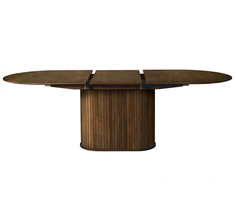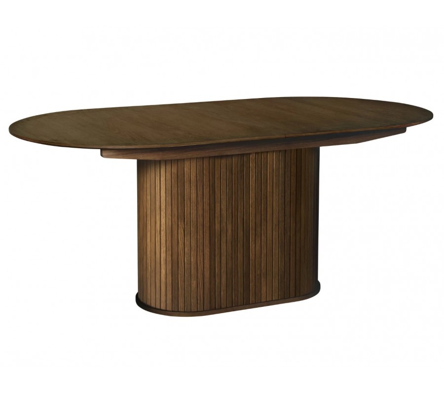 Retro rozkládací jídelní stůl Bornholm s oválnou deskou a nohou s lamelami v tmavém hnědém dubovém provedení 180-230 cm