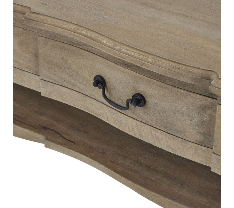 Konferenční stolek Antiquités Francaises je spojením jedinečného designu inspirovaného starožitným nábytkem a praktické funkcionality. Stolek je vyroben z masivního mangového dřeva ve světlé pískově hnědé s takzvaným washed efektem vymyté barvy, který mu dodává šarmantní vintage charakter. Ten je ještě posílen kovovými úchyty v černé barvě. Na bočních stranách stolku se jich nachází šest – čtyři jsou polobloukovité a dvě kulaté. Motivy převzaté z historického francouzského nábytku pokračují i na spodní polici, jejíž boční hrany jsou vyřezávány do tvaru elegantních křivek. Celková silueta stolku je lineární, s čímž koresponduje i reliéfní zdobení, které delší strany stolku vizuálně předěluje na tři části. Na hladké vrchní části a na rovných plochách je patrná přírodní kresba letokruhů, která vyzdvihuje přírodní charakter masivního dřeva. Každý kus je ručně vyřezávaný, což zajišťuje jeho jedinečnost a originalitu. Stolek vám také poskytuje bohatý úložný prostor ve dvou zásuvkách a na otevřené polici. Hodí se do obývacího pokoje zařízeného ve venkovském stylu, kde skvěle doplní sedačku se vzorovaným čalouněním či polštáři. Můžete jej zkombinovat is výraznějším vintage křeslem, čímž dodáte prostoru stylový eklektický nádech. Živé zelené rostliny zase pomohou vyzvednout přírodní charakter masivního dřeva. Můžete také přidat další nábytek z kolekce Antiquités Francaises, který naleznete v naší nabídce. Tento konferenční stolek bude vaším praktickým společníkem a zároveň elegantním středobodem obývacího pokoje.