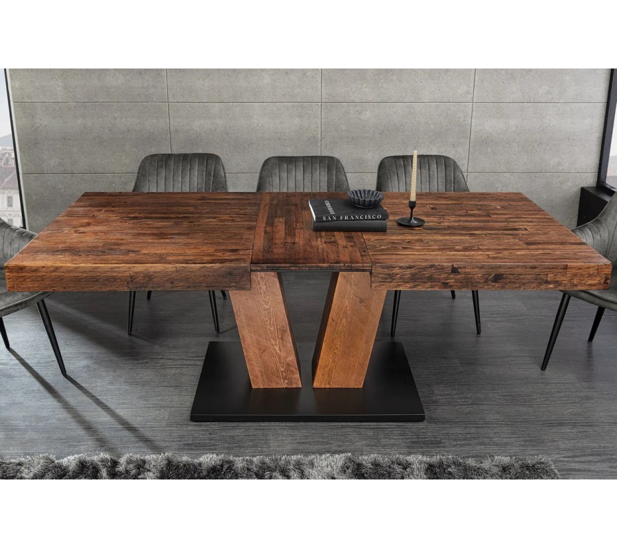 Moderní venkovský rozkládací hnědý jídelní stůl Sawyer s obdélníkovou deskou a dvěma nohama s černou podstavou 160-200 cm
