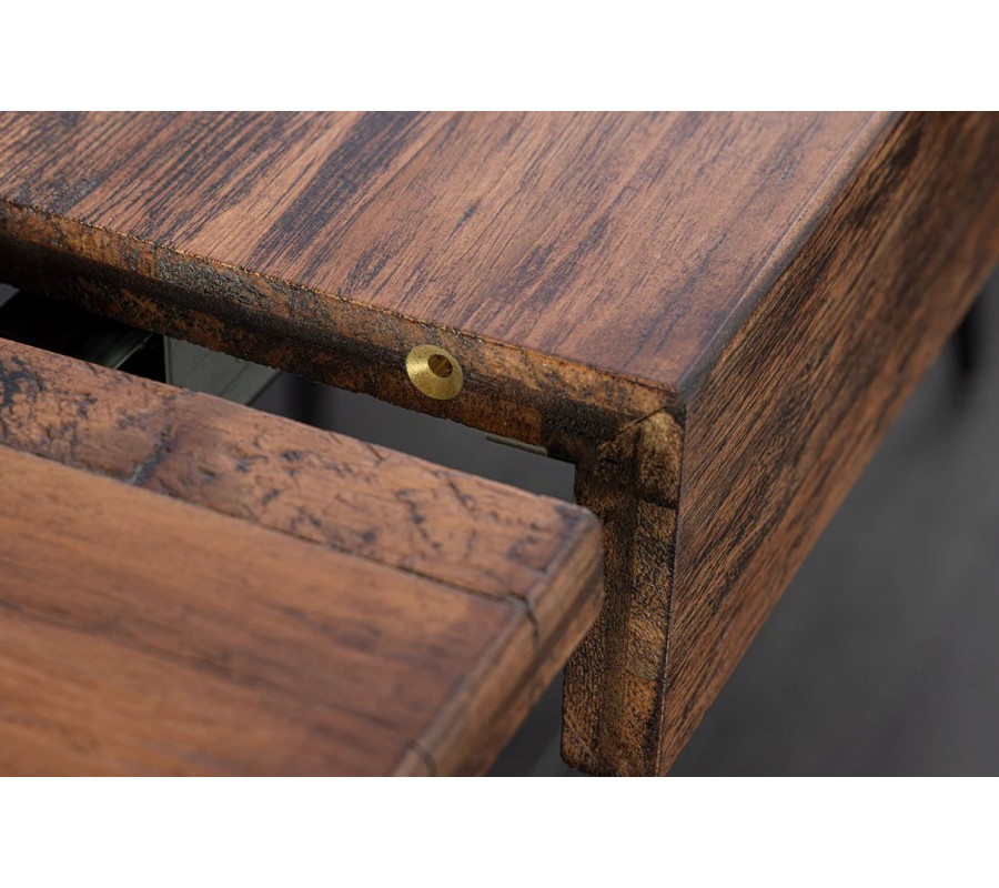 Jídelní stůl je vyroben z kombinace masivního a dýhovaného dřeva v naturálním hnědém provedení. Povrchová úprava s tmavou patinou ve vintage stylu zdůrazňuje strukturu dřeva a dodává mu rustikální výraz,