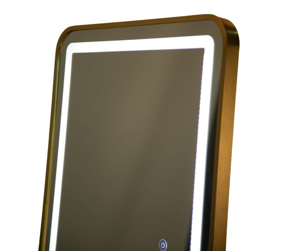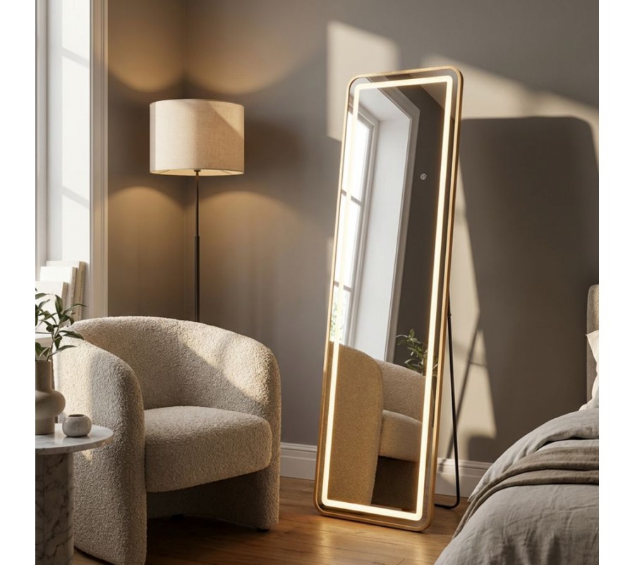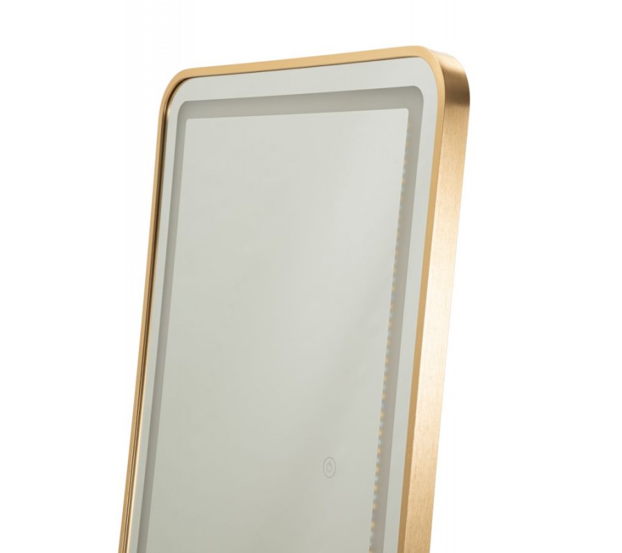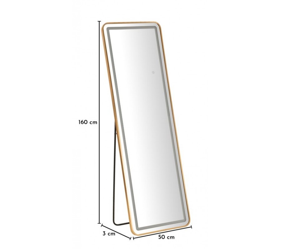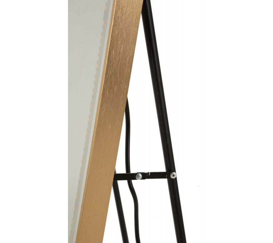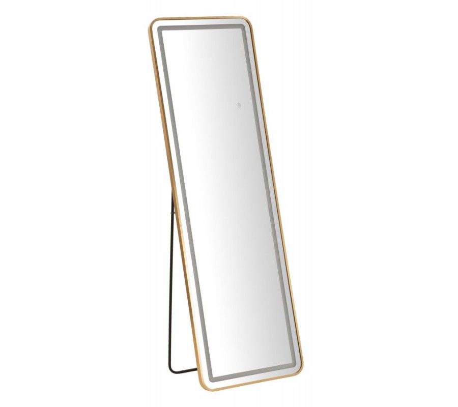 Moderní glamour stojící zrcadlo Leanor s obdélníkovým zlatým kovovým rámem a LED osvětlením 160 cm
