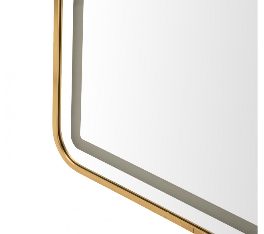 Zrcadlová plocha má vysoký, štíhlý obdélníkový tvar, který působí čistě a moderně. Lemuje ji hladký kovový rám se zaoblenými rohy v lesklém zlatém odstínu, dodávající celku nádech luxusu a elegance.