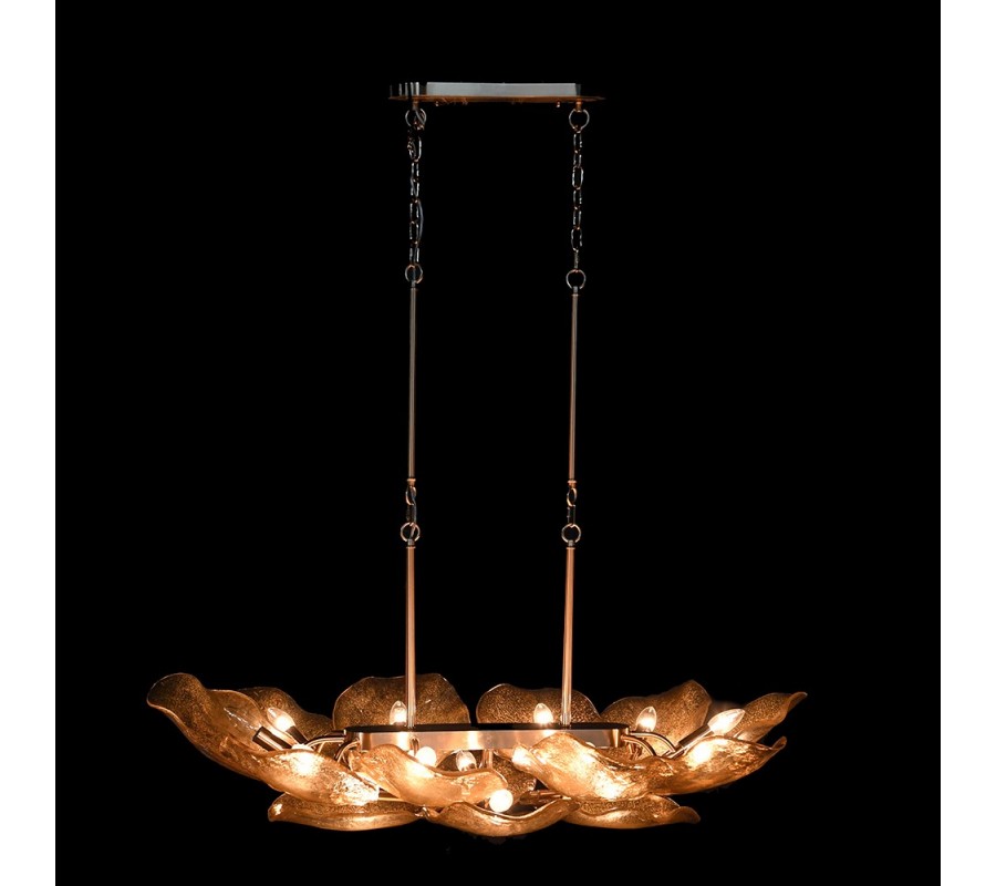 Designový glamour lustr Shape s organicky tvarovanými skleněnými stínítky ve zlatém odstínu a s kovovou konstrukcí 200 cm
