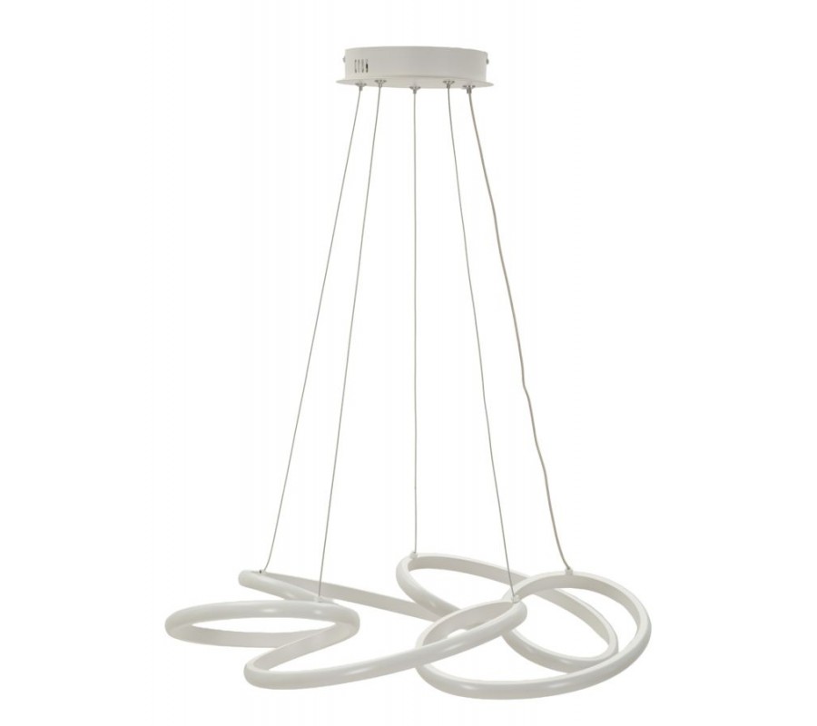 Luster je vyroben z kombinace kovu a plastu, což mu zaručuje pevnost a zároveň odlehčenou váhu. Základem je konstrukce štíhlého kruhového tvaru o průměru 55 cm, ohýbaná do výrazných křivek a smyček. Tvar je dynamický, bohatý a zároveň pravidelný, což jí v kombinaci s čistým bílým provedením dodává moderní výraz. Konstrukci doplňují po obvodu LED pásy, které poskytnou bohaté osvětlení se třemi stupni teploty - studeným bílým, neutrálním a teplým žlutým. Čtyři závěsná lanka a přívodní kabel zaručují stabilitu a ve vrchní části je doplňuje kulatý stropní kryt.