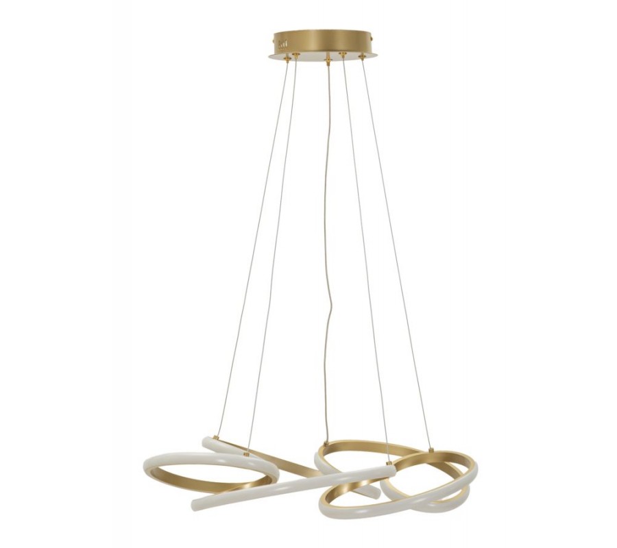 Luster má lesklou zlatou konstrukci, vyrobenou z kombinace kovu a plastu. Je pevná a zároveň optimálně odlehčená pro komfortní zavěšení. Ke stropu se upevňuje prostřednictvím kulaté krytky, ze které vycházejí čtyři závěsná lanka a přívodní kabel. Osvětlovací prvek má tvar štíhlého kruhu, který je výrazně ohýbán do pravidelného smyčkového designu. Po celé délce jej doplňuje LED pás se třemi nastavitelnými stupni teploty osvětlení - studeným bílým, neutrálním a teplým žlutým. Silueta působí vzdušně adynamicky.