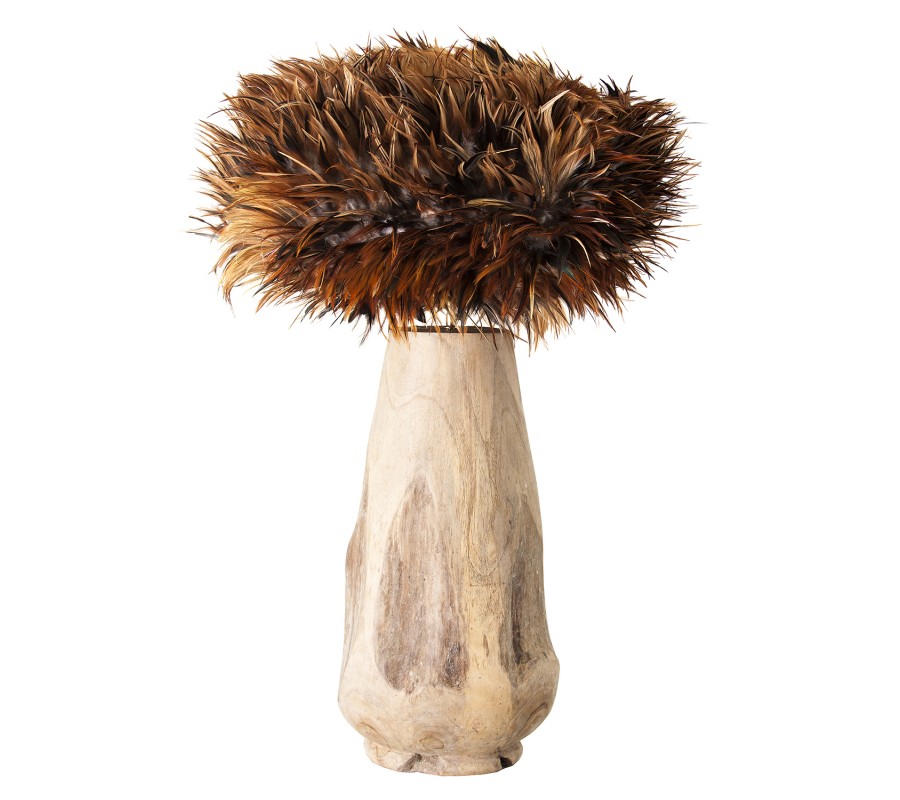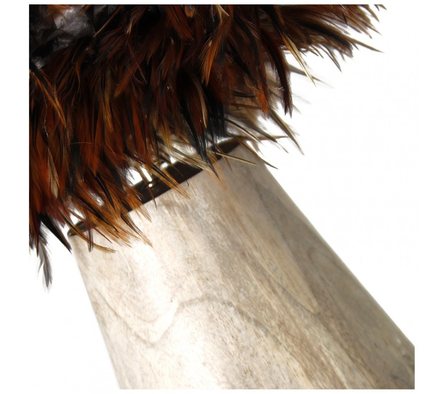 Luxusní lampa PLUMAS má základnu z teakového dřeva, po níž následuje velmi poutavé stínítko pokryté peřím.