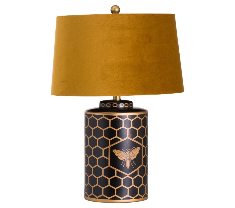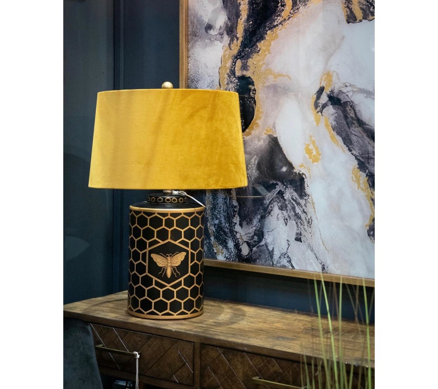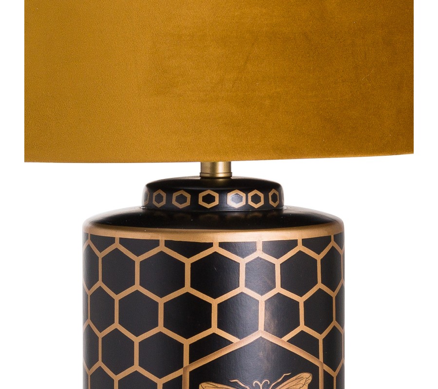 Luxusní stolní lampa Abeja je nádherným představitelem art-deco stylu. Důmyslná kombinace černé a hořčicové barvy sametového stínítka zajišťuje lampě opravdový šmrnc, který podtrhává kresba zlaté barvy, zobrazující pozadí v tvarech připomínajících včelí plástev a siluetu včely samotné. Lampa Abeja dokonale zapadne zejména do obýváků, předsíní, ložnic, či reprezentačních prostor firem se zemitými barvami as dekoracemi z luxusních materiálů jakými jsou například povrchy připomínající drahé kovy.
