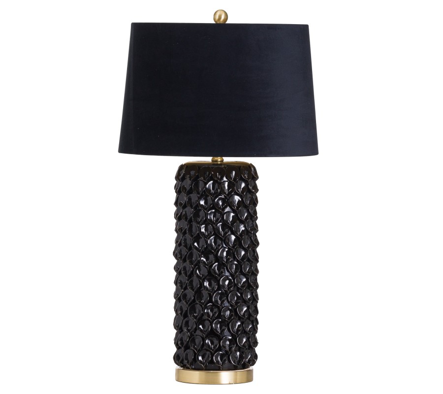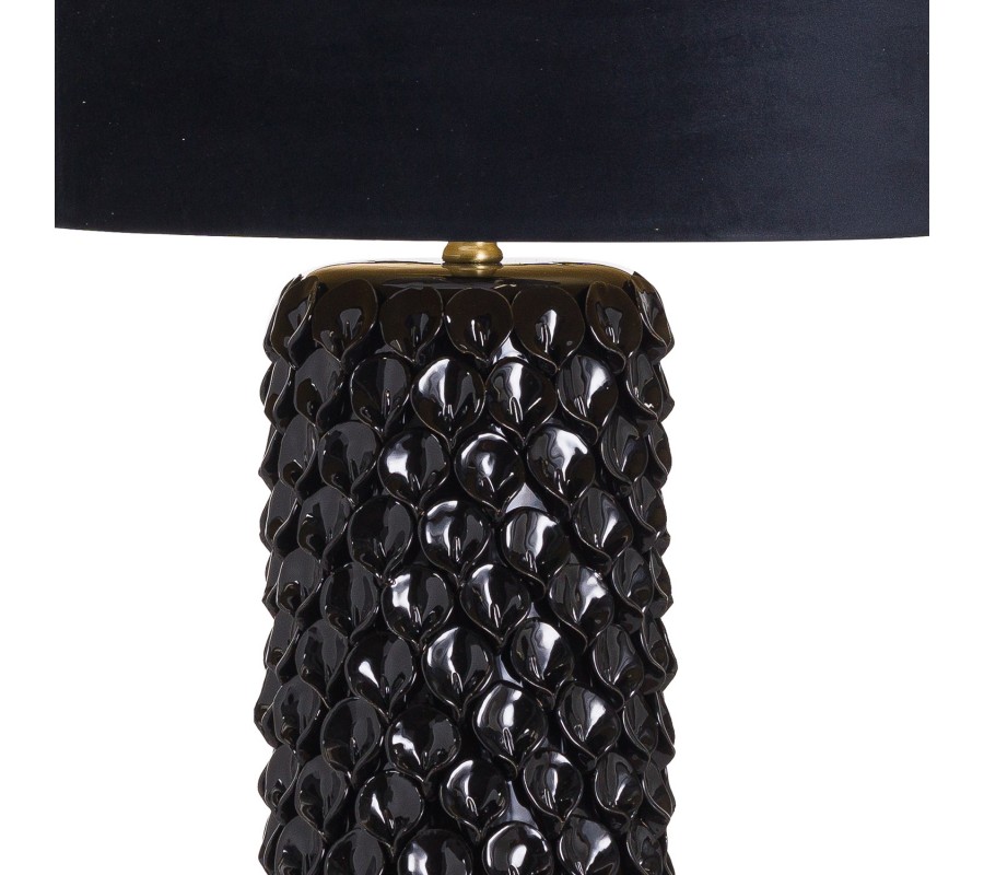 Jedinečná stolní lampa Noirra je dokonalým představitelem půvabu, luxusu a nestárnoucí elegance. Stylová černá podstava je vyrobena z keramiky se strukturovaným a výrazně členitým povrchem, který zopakuješ po celé její ploše vzor připomínající rybí šupiny. Lesklá glazura na černé keramické podstavě je elegantně doplněna černým sametovým stínítkem a drobnými zlatými prvky. Stolní lampa Noirra se stane dokonalým doplněním nočního stolku ve vaší luxusní ložnici, bude se vyjímat na příručním stolku v obývacím pokoji, hale či předsíni jako doplňkové osvětlení při oblíbeném křesle na čtení či dokonce vynikne jako jedinečné dotvoření světelné atmosféry v luxusních podnicích v Art-deco stylu.