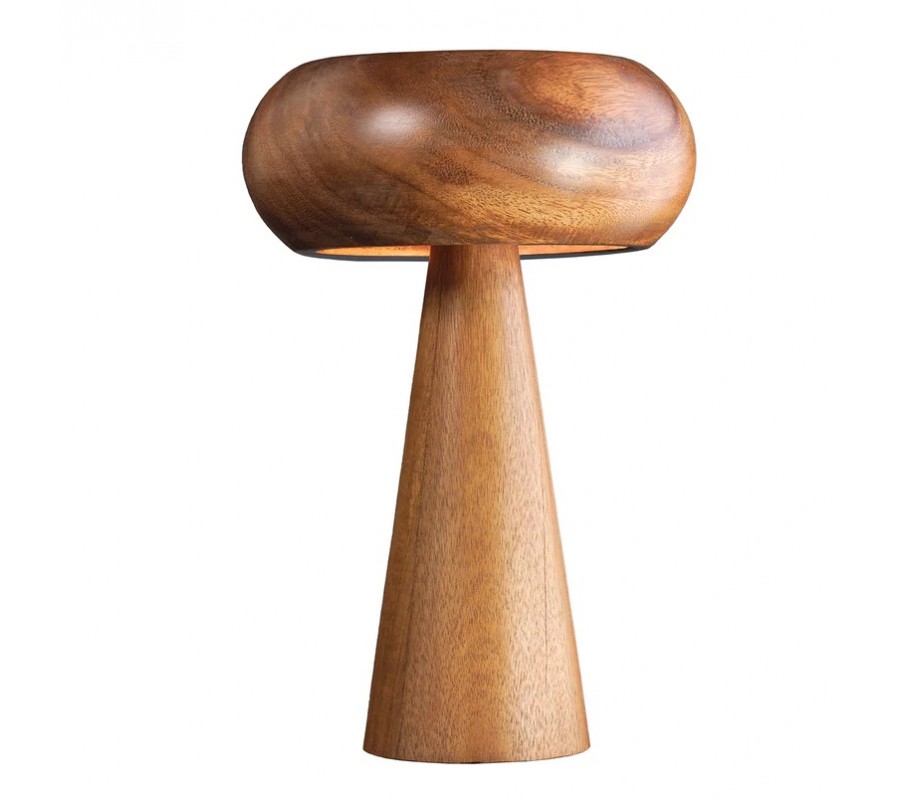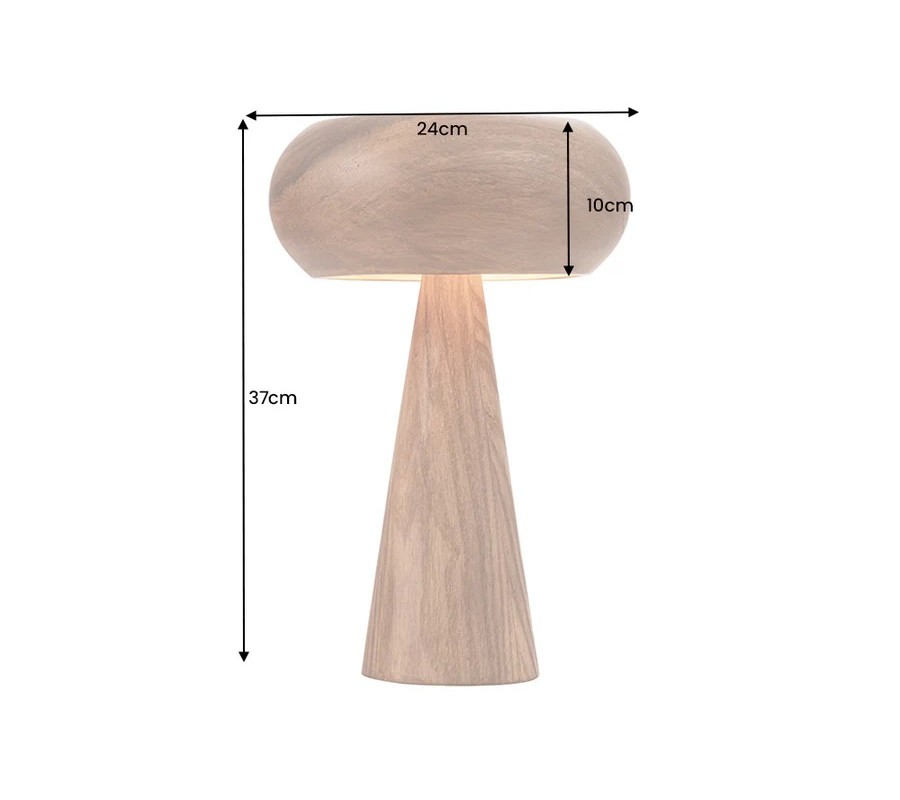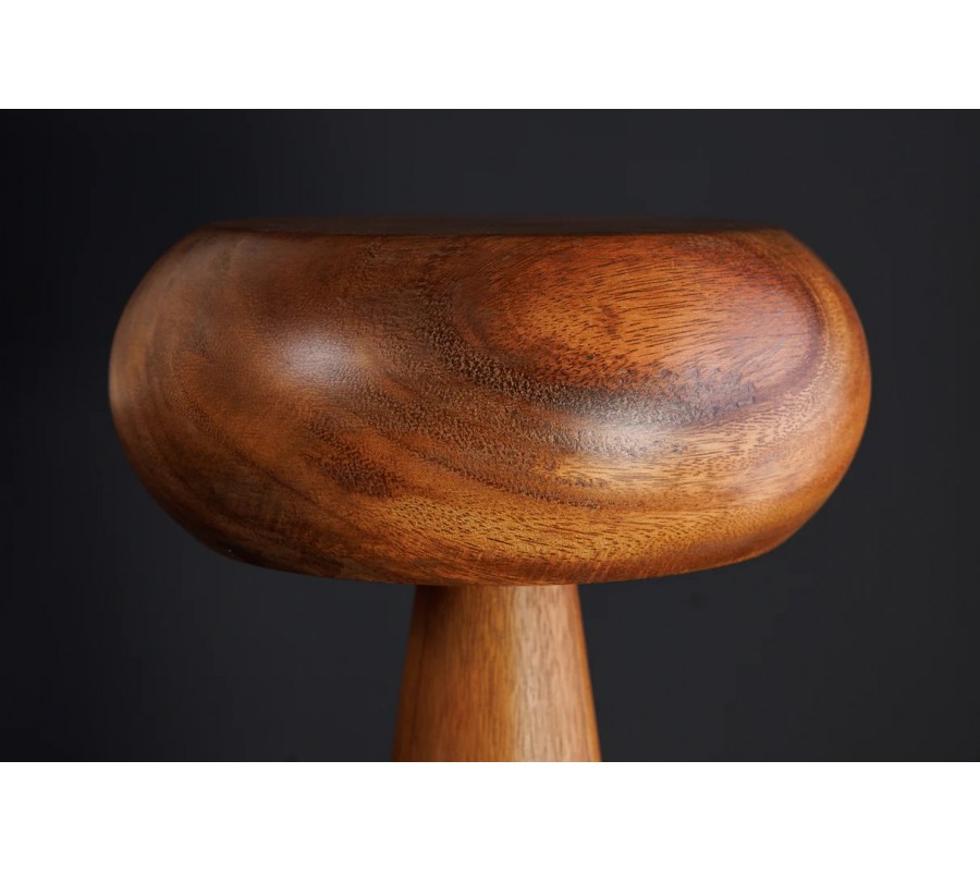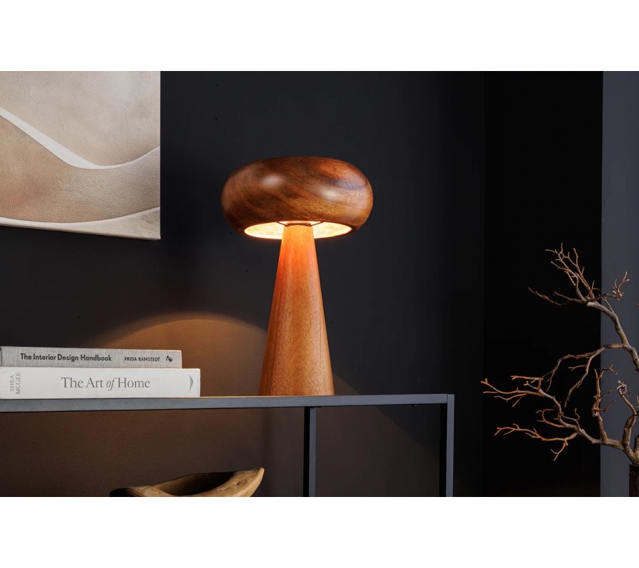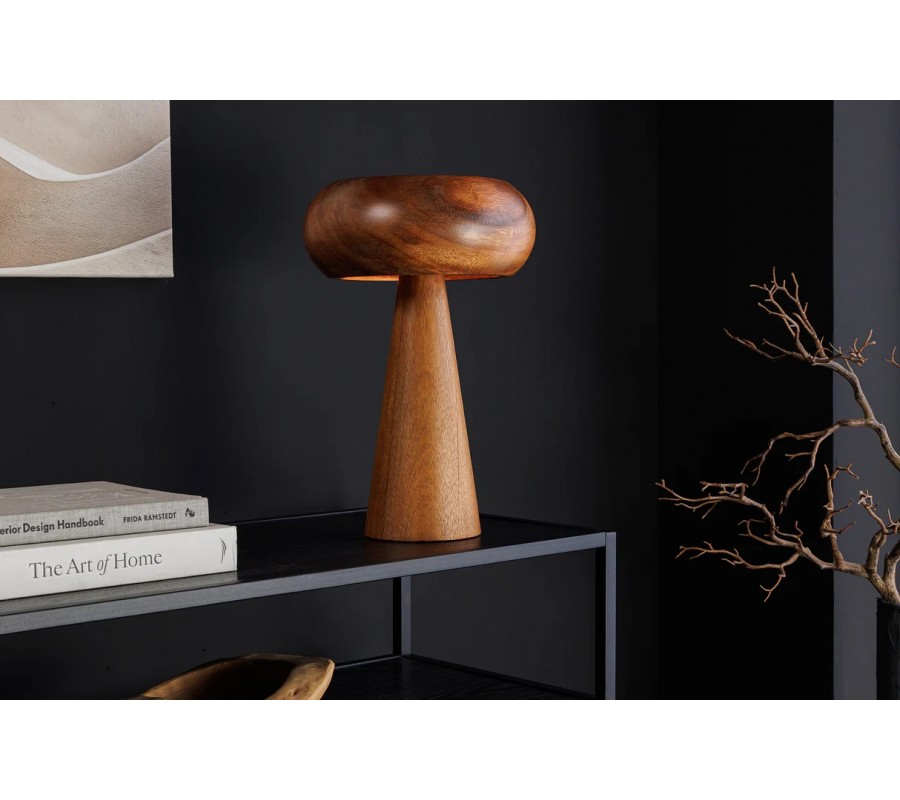 Stolní lampa Fungi přitahuje pozornost svým designem, jemně tvarovanými liniemi a jedinečnou podobou připomínající houbu. Je vyrobena z masivního akáciového dřeva v teplém hnědém odstínu, přičemž na celé ploše krásně vyniká přirozená kresba dřeva. Povrch je hladký a příjemně jemný na dotek.