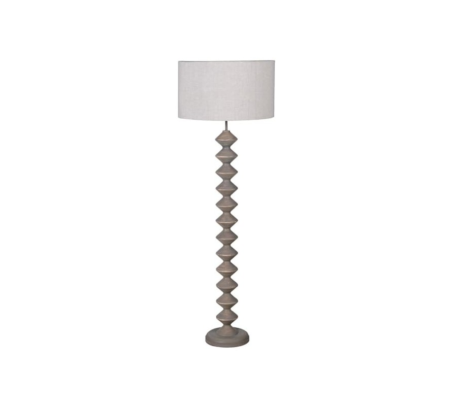 Luxusní venkovská stojací lampa Quart s vyřezávanou dřevěnou nohou a lněným stínítkem v šedé barvě 155 cm
