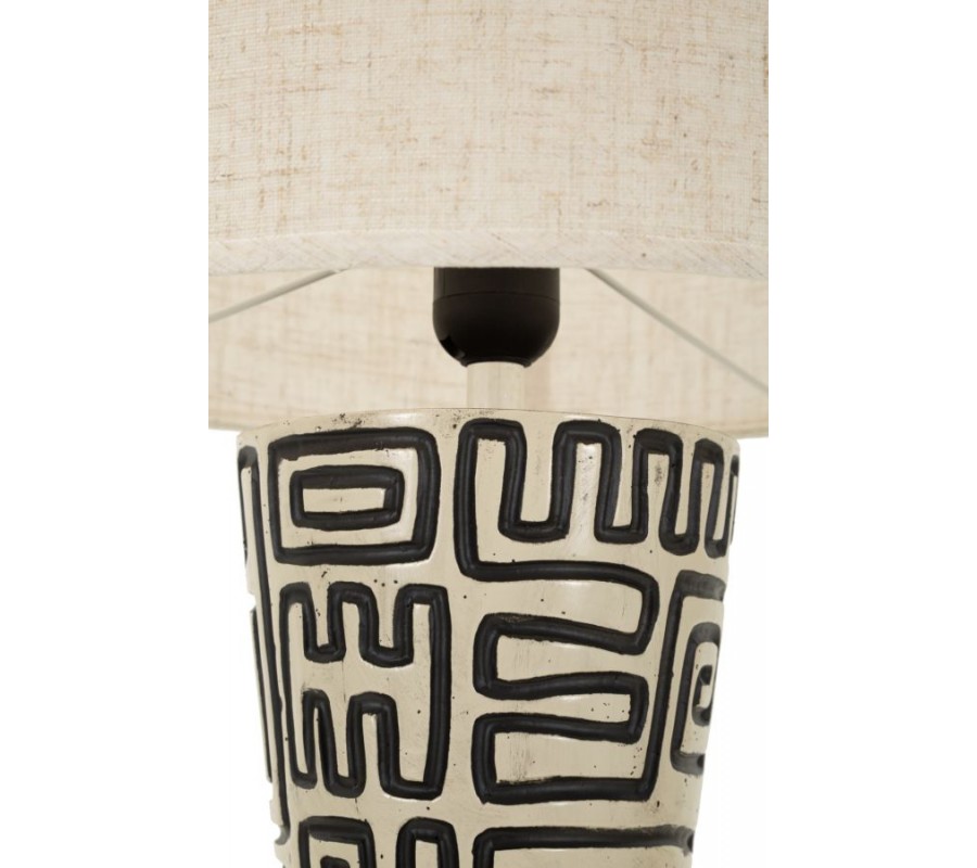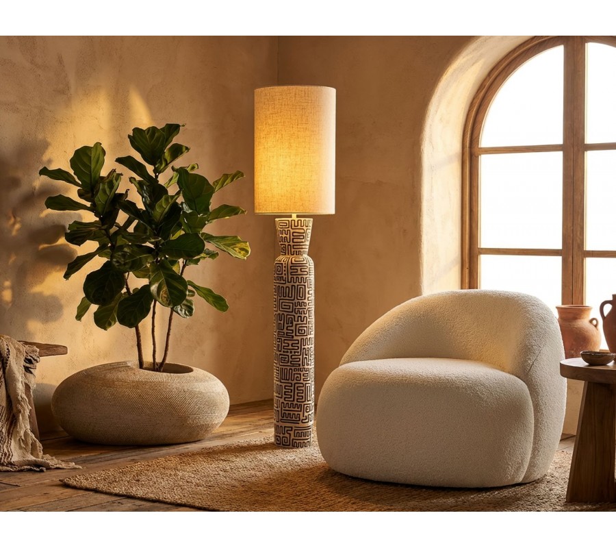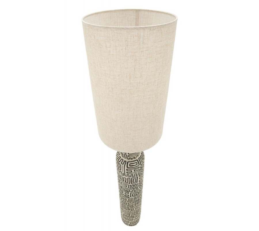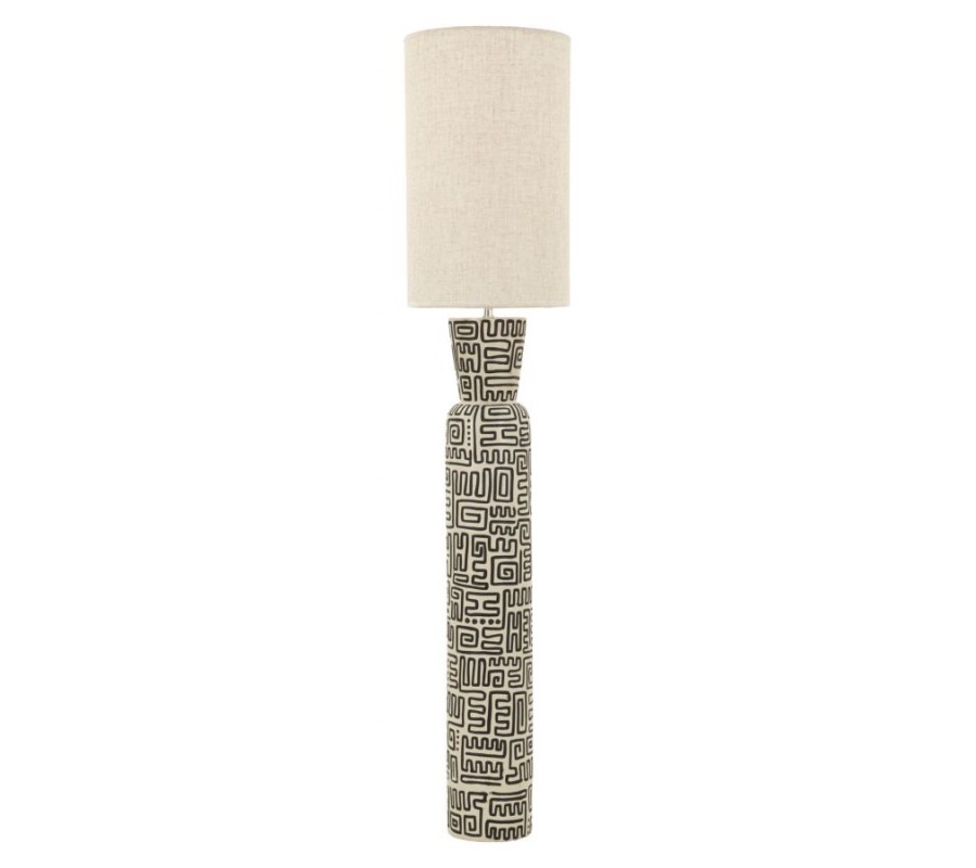 Moderní designová stojací lampa zaujme již na první pohled svou štíhlou kulatou siluetou a výraznou nohou z pryskyřice, která je dekorována černými geometrickými liniemi na béžovém podkladu. Vzor působí graficky a sofistikovaně, ale zároveň má jemný etno nádech, díky čemuž lampa nepůsobí chladně, ale přirozeně a útulně. Válcové textilní stínítko v béžové barvě harmonicky doplňuje dekor nohy, zjemňuje kontrast a vytváří příjemné, rozptýlené světlo vhodné pro večerní osvětlení prostoru.