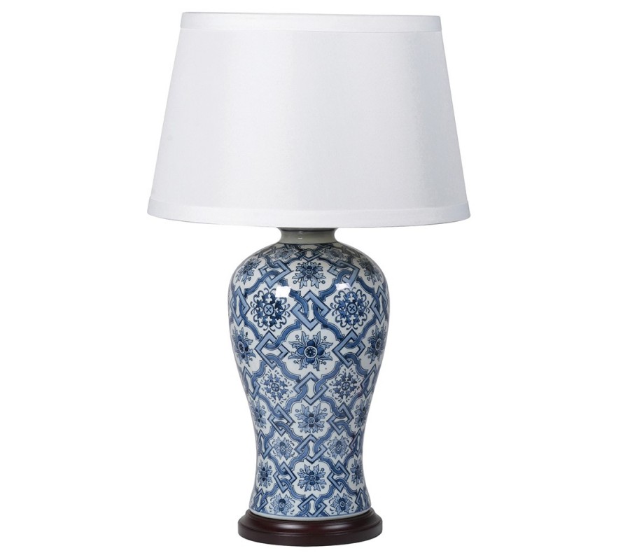 Vintage keramická modro-bílá stolní lampa Geraldine s jemnou ornamentální kresbou a podstavou z dubového dřeva 73cm
