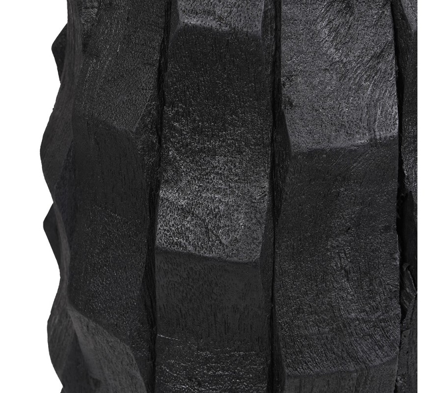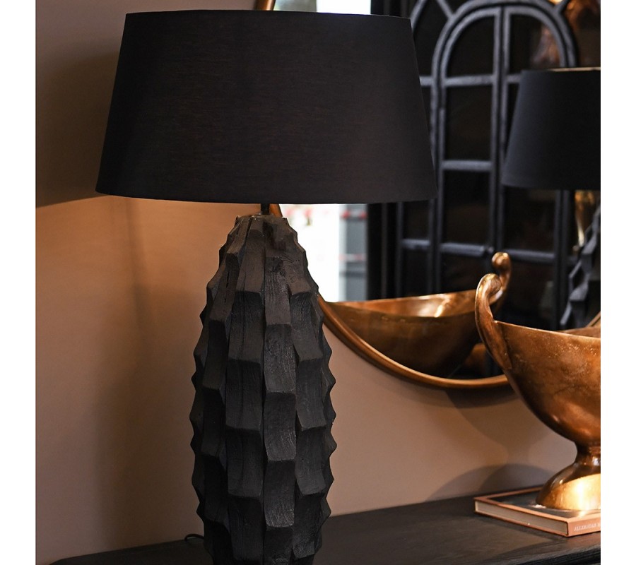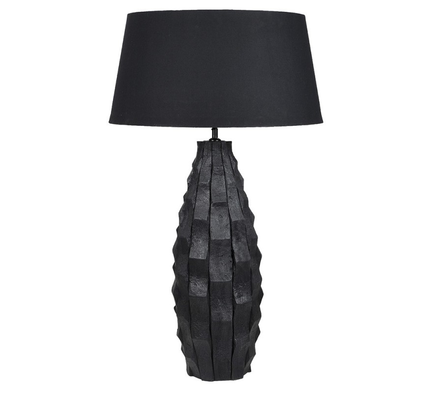 Moderní designová stolní lampa Coalwood v černé barvě s vyřezávanou podstavou s geometrickým vzorem ze dřeva 90 cm