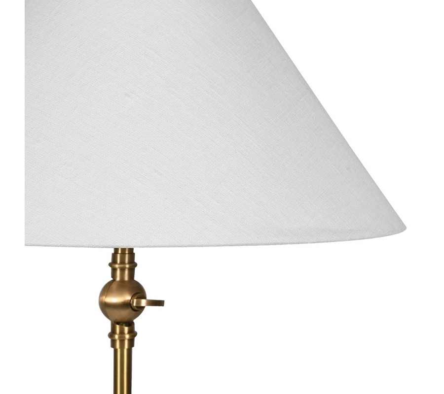 Lampa má elegantní siluetu, která jí v kombinaci s mosazným kovovým zlatým provedením dodává stylový vintage charakter. Dlouhá štíhlá válcovitá noha je ve spodní části zasazena do jednoduché čtvercové podstavy. Konstrukce stínítka se k noze připojuje přes kulatý šroub a tento detail působí starožitným dojmem.