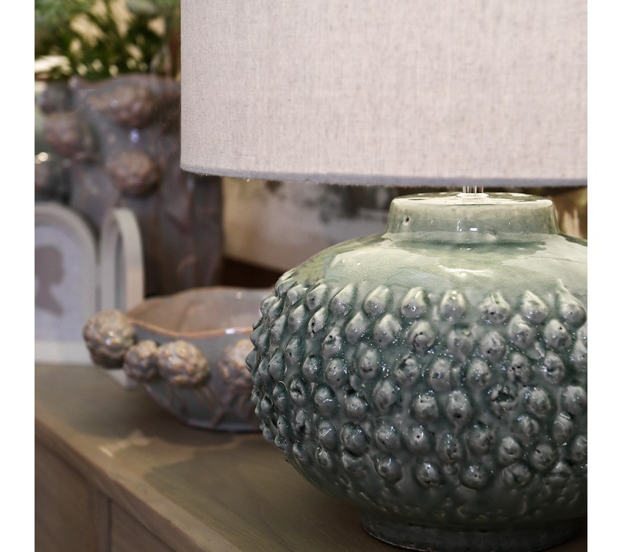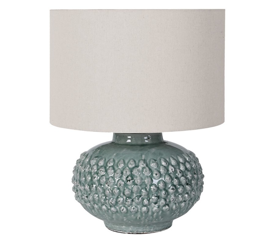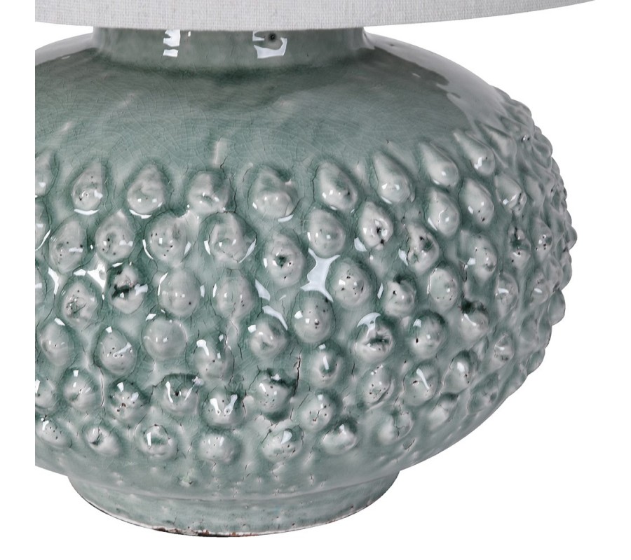 Lampa má elegantní siluetu, s mohutnou podstavou a válcovitým stínítkem. Podstava je vyrobena z keramiky a lakována v elegantním pastelovém tyrkysově modrém odstínu. Má výrazně rozšířenou střední část a směrem dolů se mírně zužuje. Ve vrchní části přechází do štíhlého hrdla, na kterém je umístěn závit na žárovku typu E37, která není součástí balení.