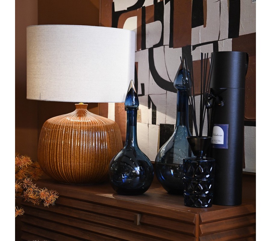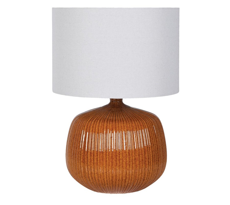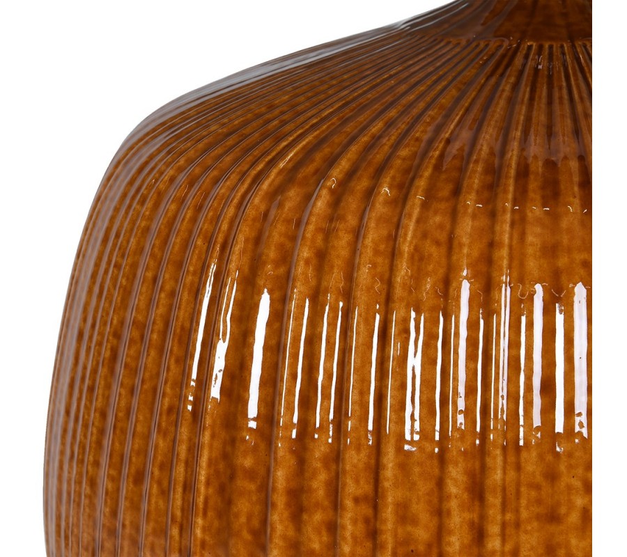 Lampa má širokou podstavu kulatého tvaru, která prudce přechází do úzkého hrdla. Je vyrobena z keramiky a zdobí ji dlouhé vertikální zářezy, vytvářející husté žebrování. Lakování v karamelově hnědé barvě je jemně nepravidelné a střídání tmavších a světlejších tónů vytváří zajímavou strukturu. Povrchová glazura má vysoký lesk, který v kombinaci s drážkovaným designem vytváří bohaté odlesky světla.